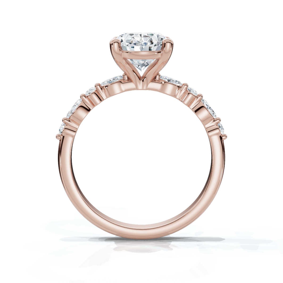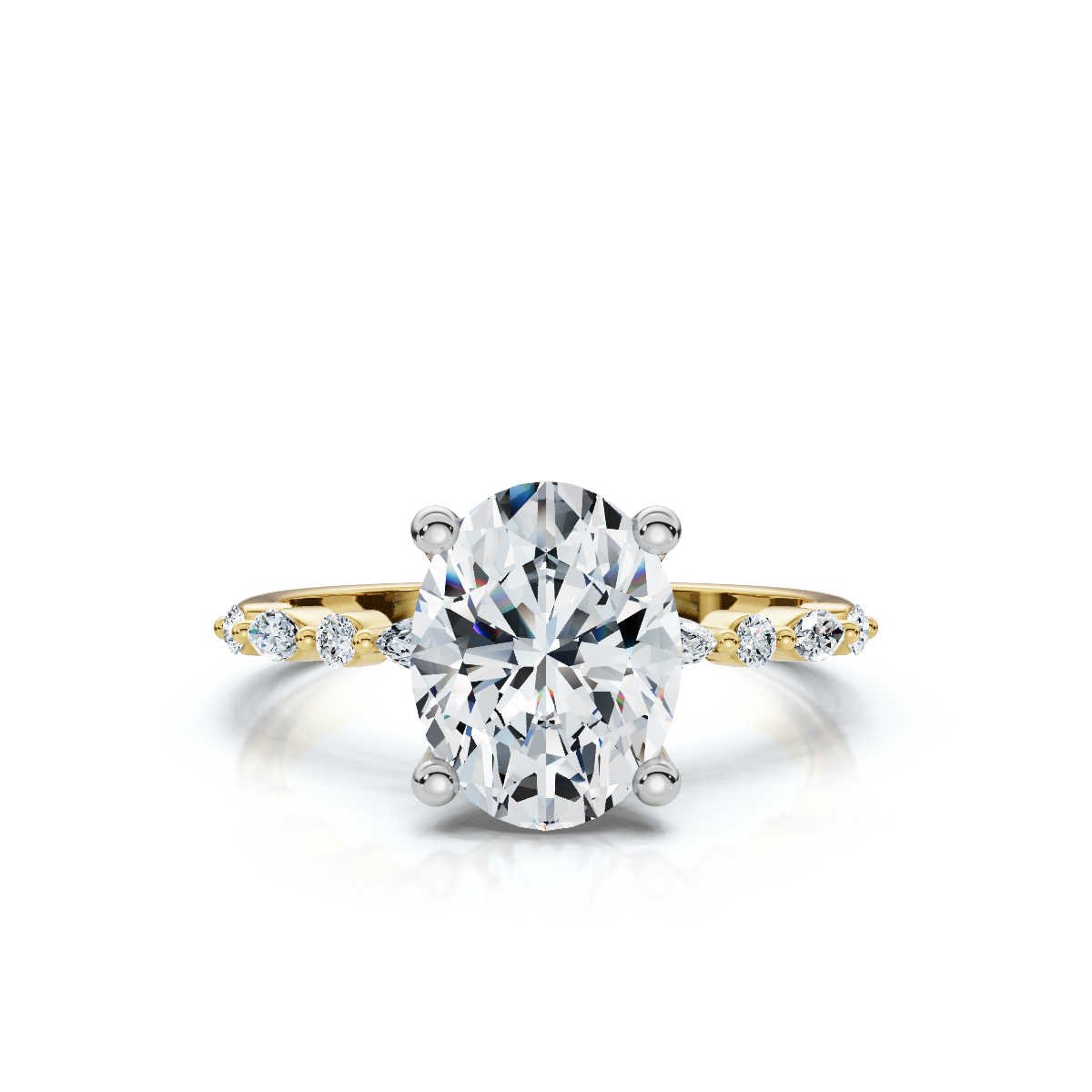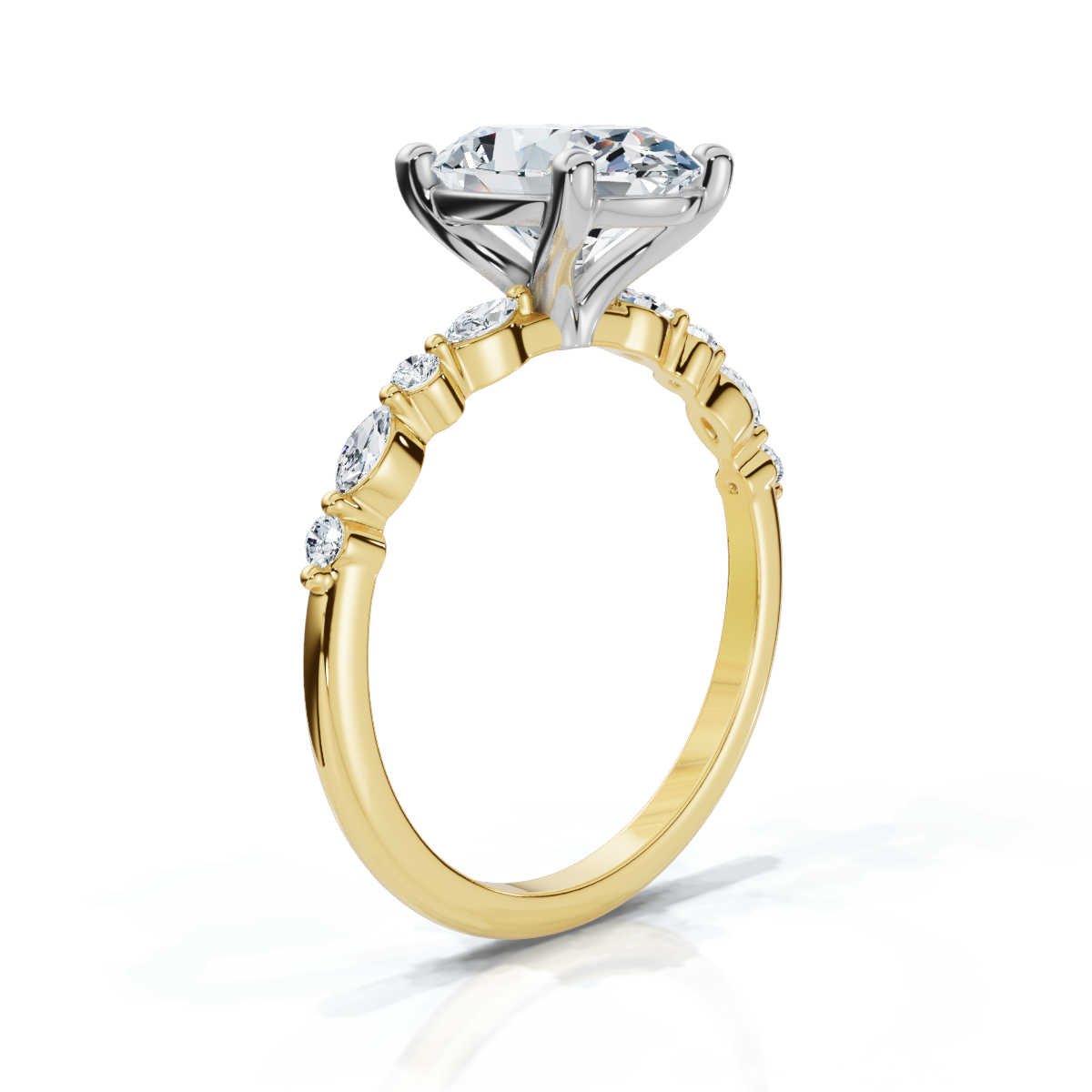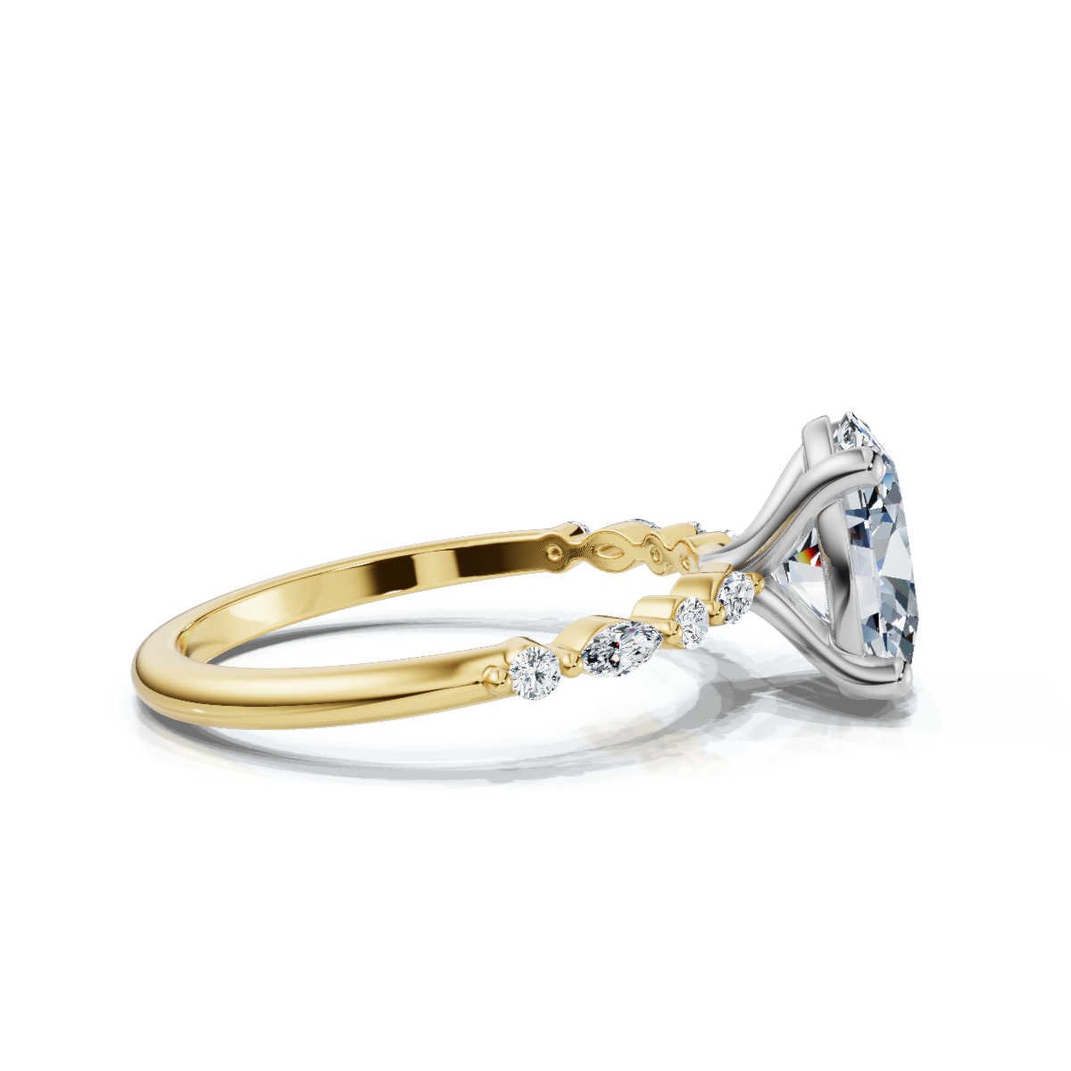 A 2ct oval Moissanite engagement ring in 14K solid gold, featuring a basket setting with 0.16ct round and marquise side diamonds for added brilliance.