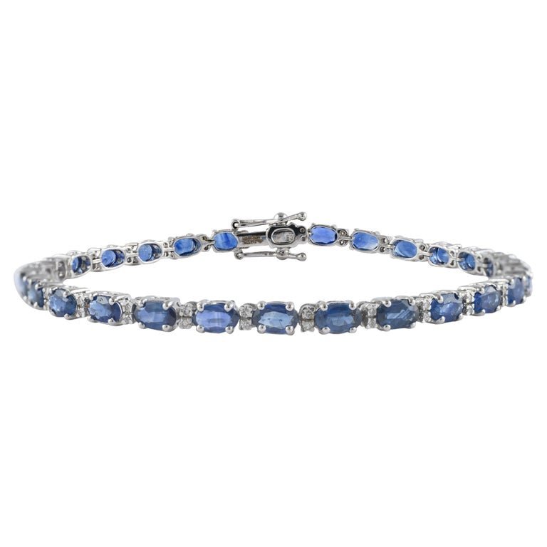 The 14K Solid Gold Blue Sapphire Diamond Tennis Bracelet is a luxurious piece that combines the deep allure of blue sapphires with the dazzling brilliance of diamonds. Crafted from 14K solid white gold, this bracelet features an array of exquisite blue sapphires, each measuring 3 x 5 mm, with a total gemstone weight of 7.7 carats. The rich blue sapphires are perfectly complemented by the sparkling diamonds, adding a touch of sophistication and elegance to the design.