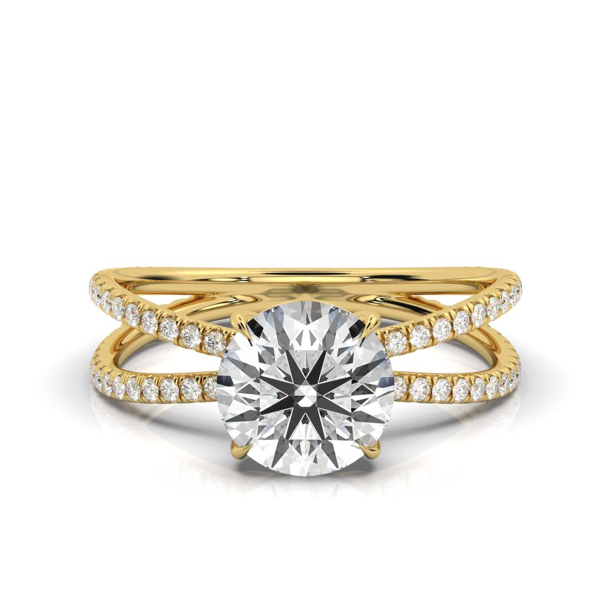 A luxurious 14K solid gold ring featuring a 2 ct Moissanite diamond in a claw prong setting, accented by 98 sparkling side diamonds (0.87 ctw). Available in White, Yellow, and Rose Gold. GRA certified.