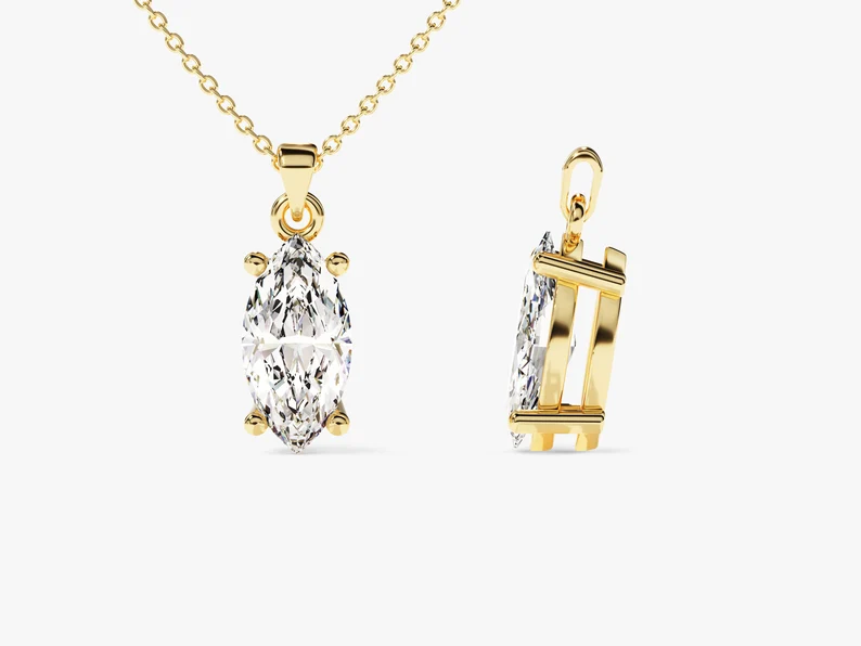 The piece can be ordered in your selection of white, rose, or yellow 14K solid gold; with pendant offerings perfect for informal and even formal glamour. The Marquise diamond cut gives an iconic and attractive look to it, and at the same time also boosts the perceived size and brightness of the stone, delivering great shine and fire.