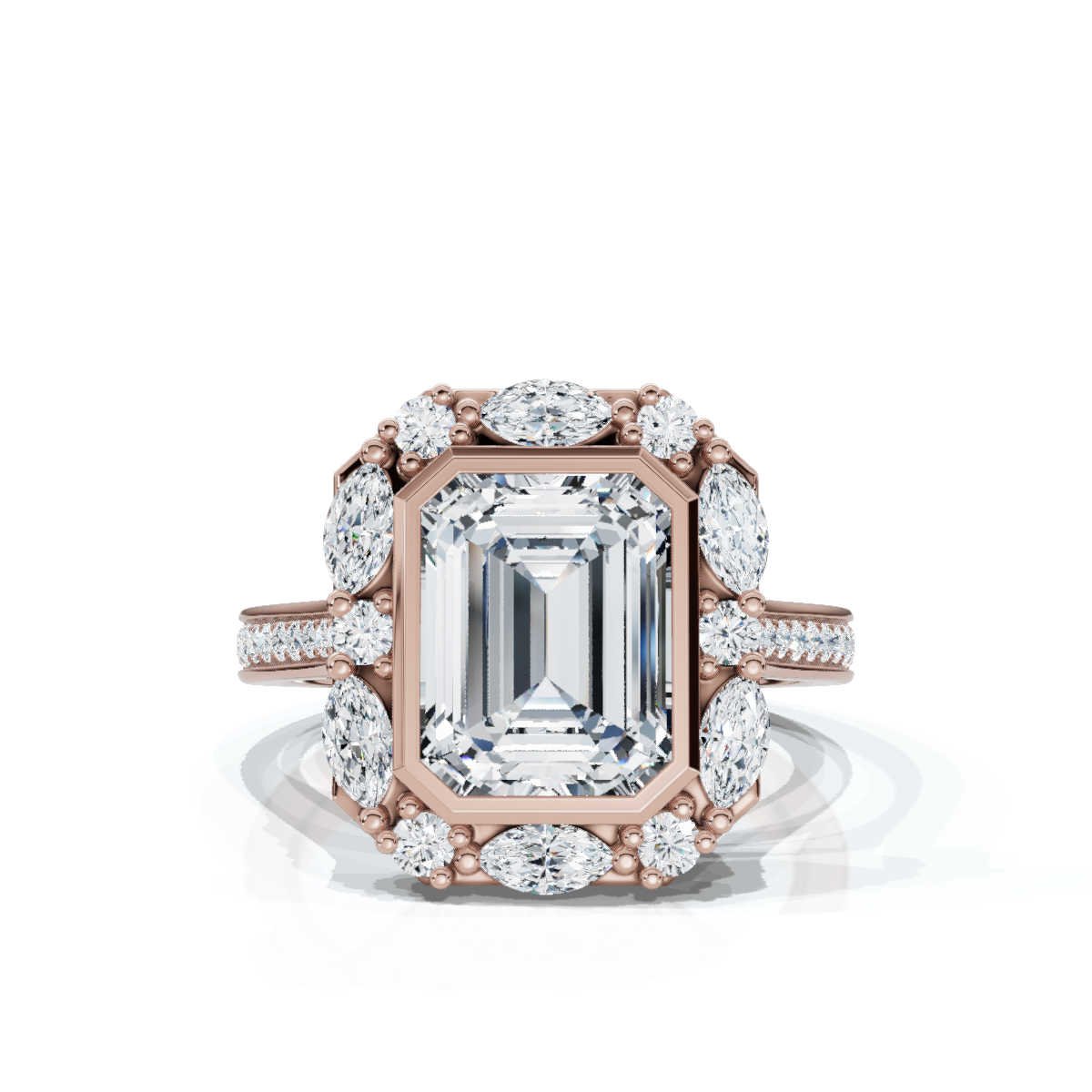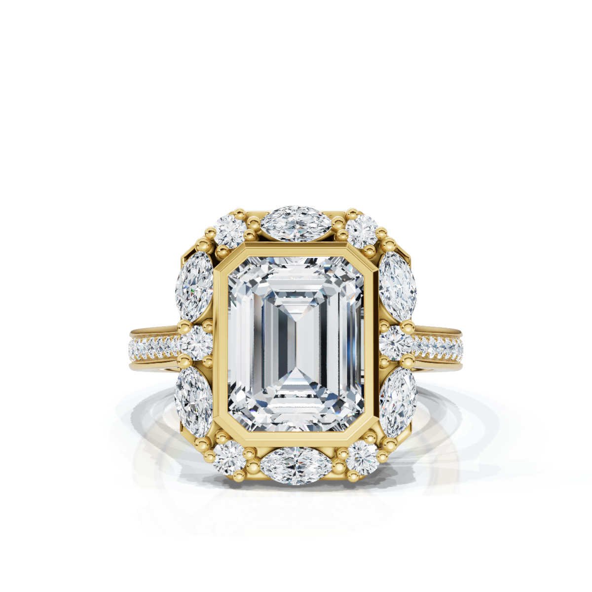 A 14K solid gold emerald cut halo engagement ring featuring a 2ct lab-grown emerald-cut diamond, surrounded by 0.9ct round and marquise diamonds. Available in white, yellow, or rose gold, with IGI & BIS certification and a comfortable fit.