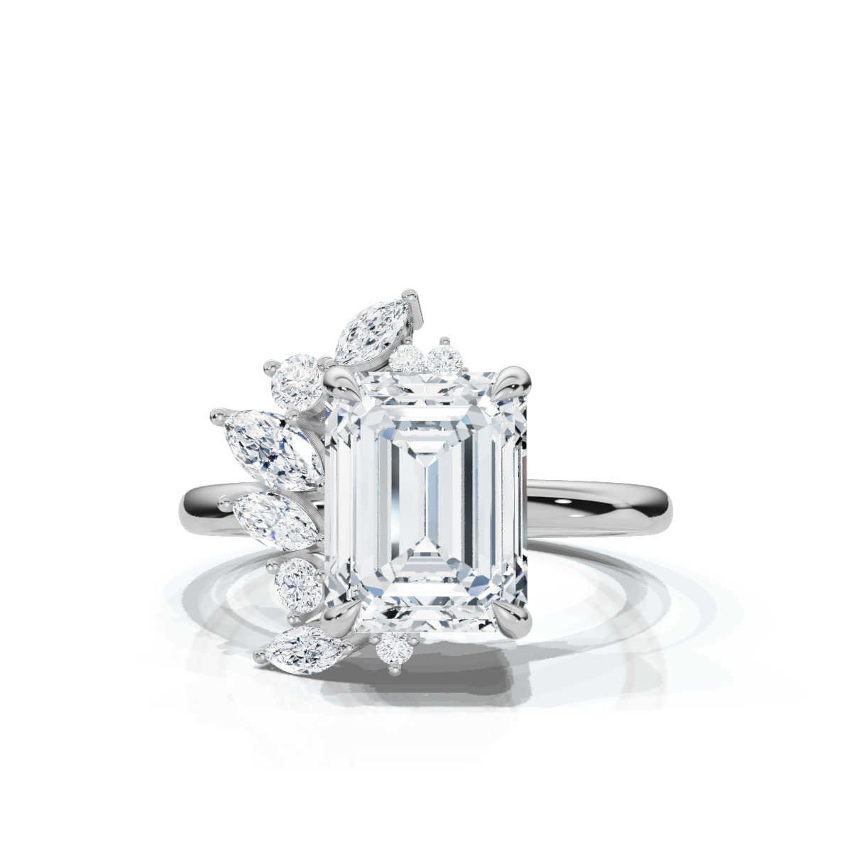 - Center Stone: 2ct Emerald-Cut Moissanite Diamond (Super Cut)