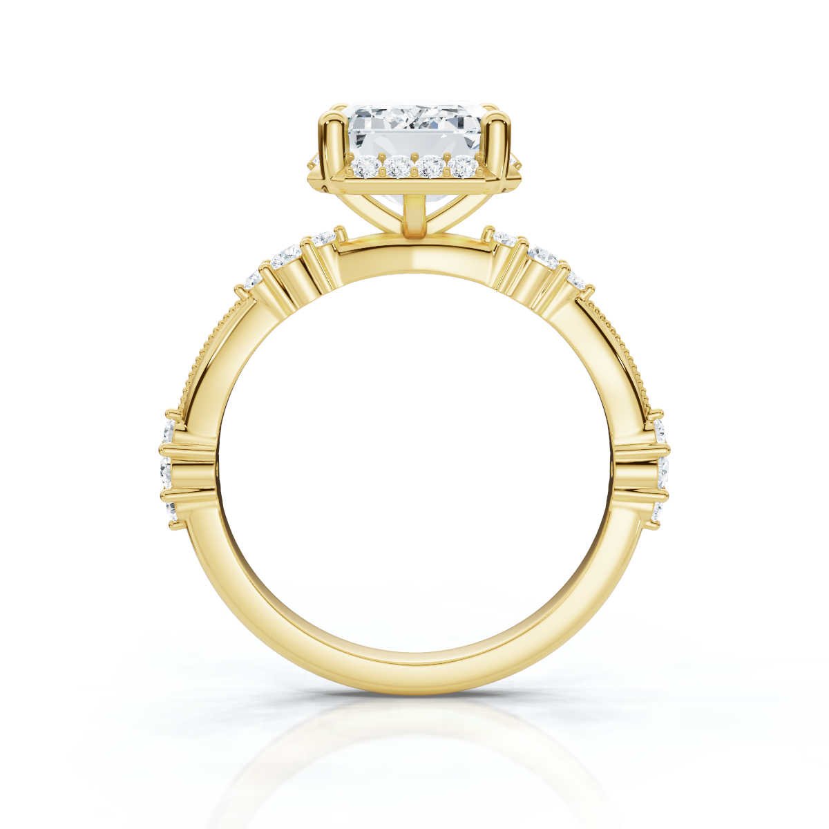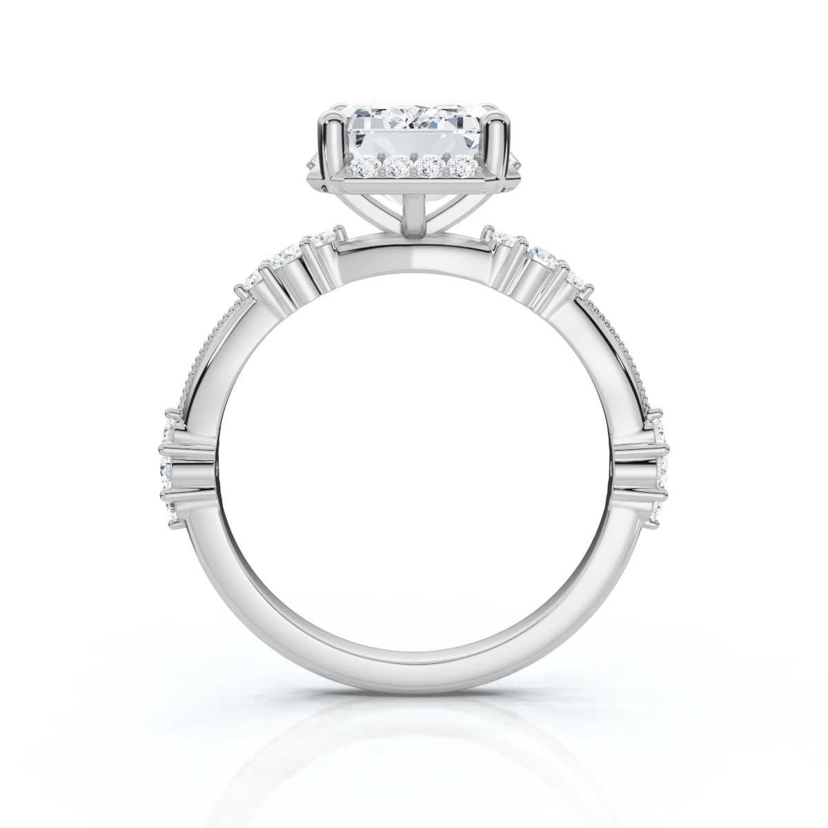 - Center Stone: 2ct Emerald-Cut Moissanite Diamond (Super Cut)