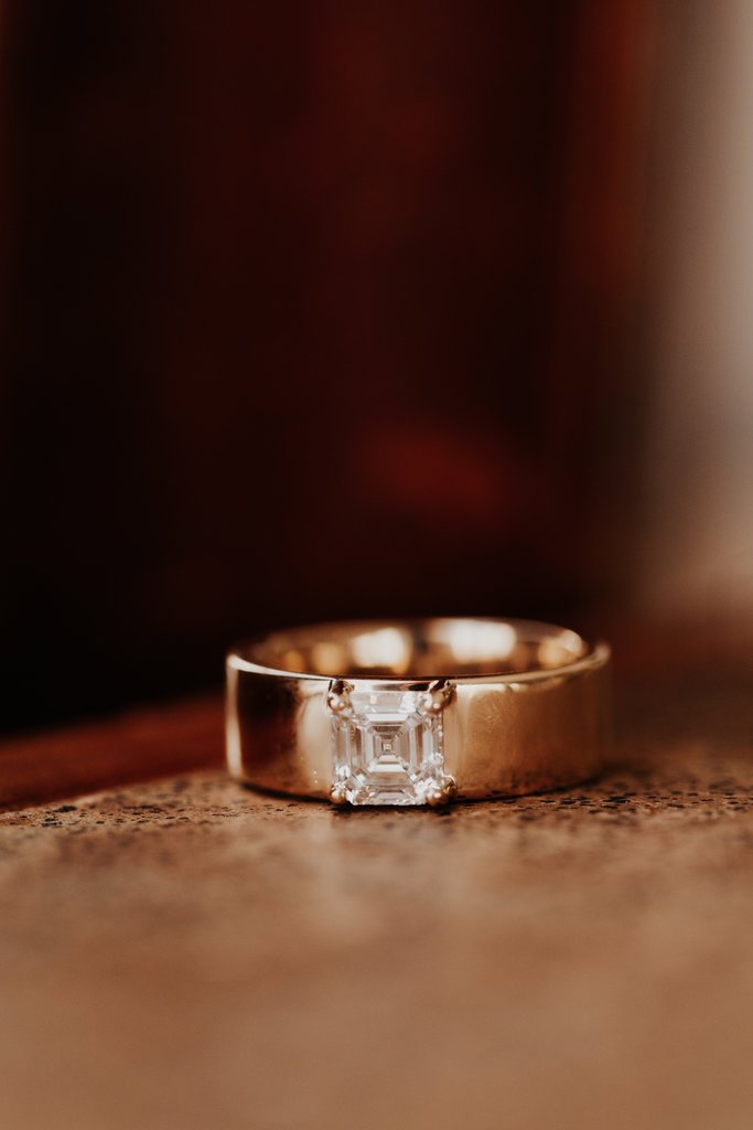 Modern elegance meets bold design in this 14K solid gold cigar band ring featuring a solitaire Asscher cut lab-grown diamond. IGI & BIS certified.