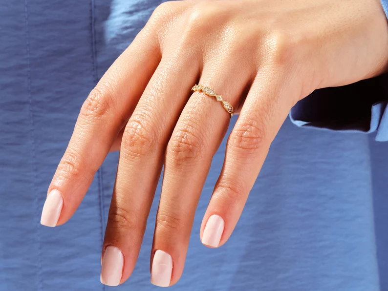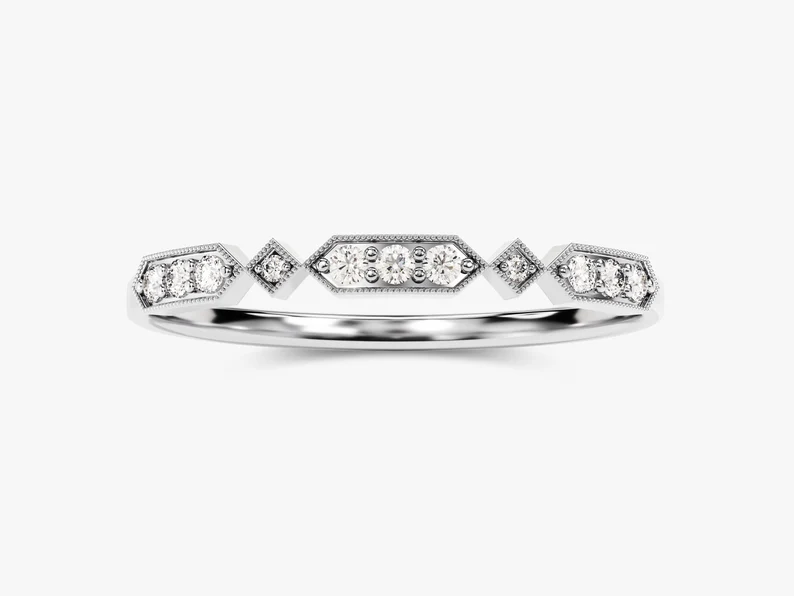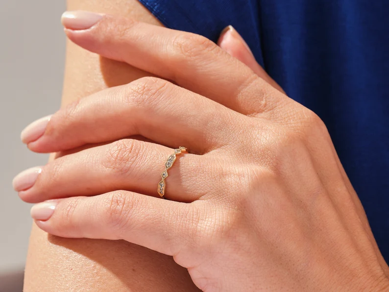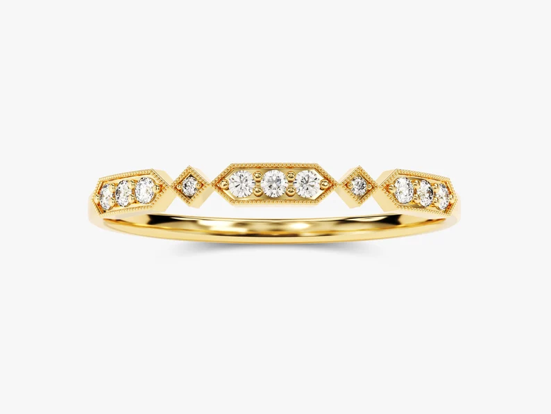 This 14K solid gold wedding ring features delicate migraine detailing in an Art Deco design—perfect for vintage lovers seeking timeless elegance and grace.