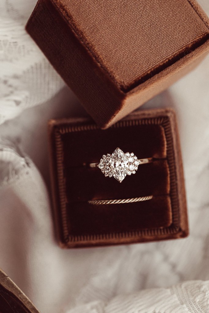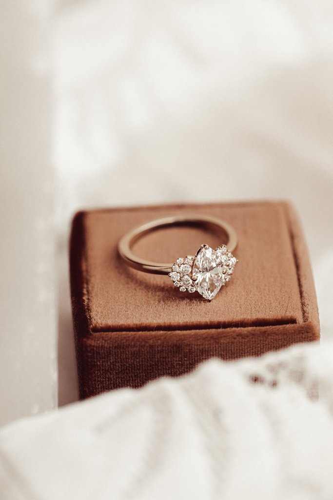 At its center is a brilliant marquise-cut Moissanite gemstone, known for its elongated shape that enhances finger length and its remarkable sparkle. With its exceptional fire and brilliance, Moissanite is a sustainable and ethical alternative to traditional diamonds, ensuring luxury with a conscience. The meticulously designed setting further enhances the gemstone’s radiance, making it the perfect statement piece.