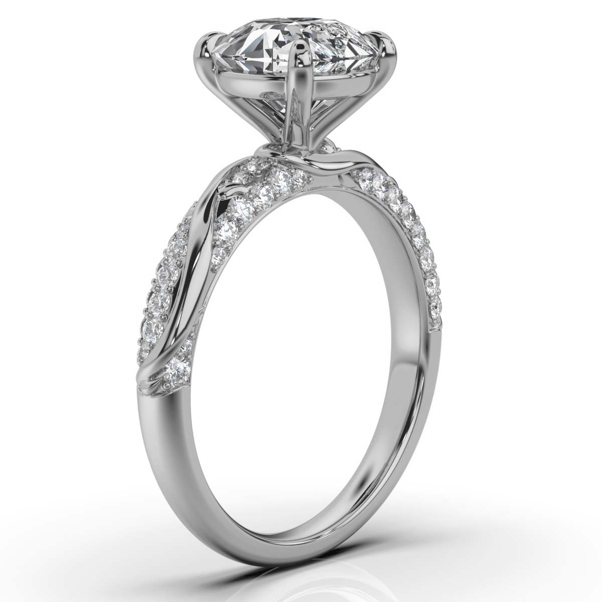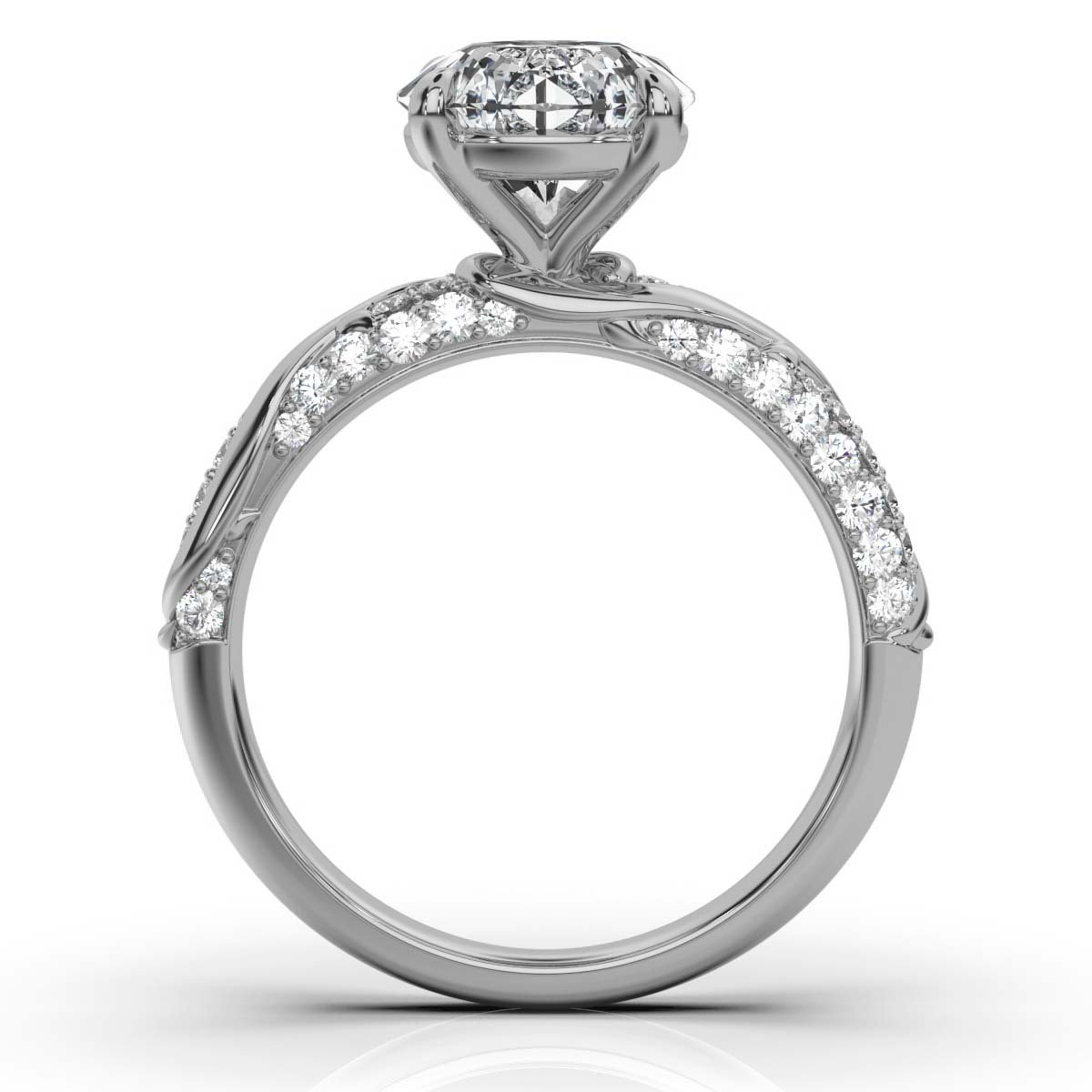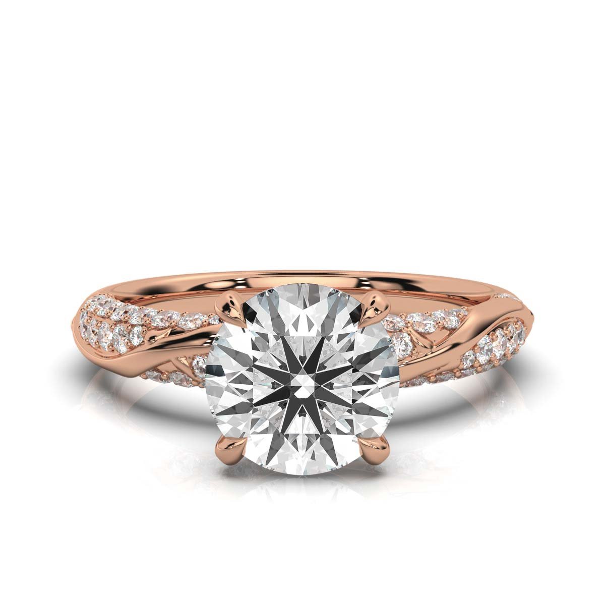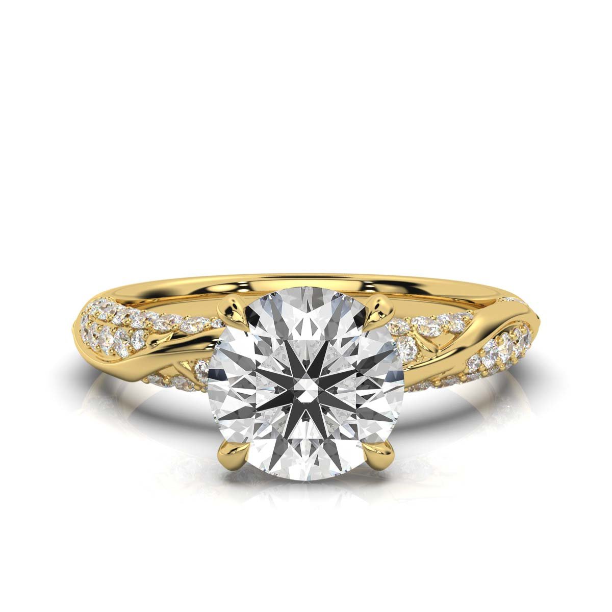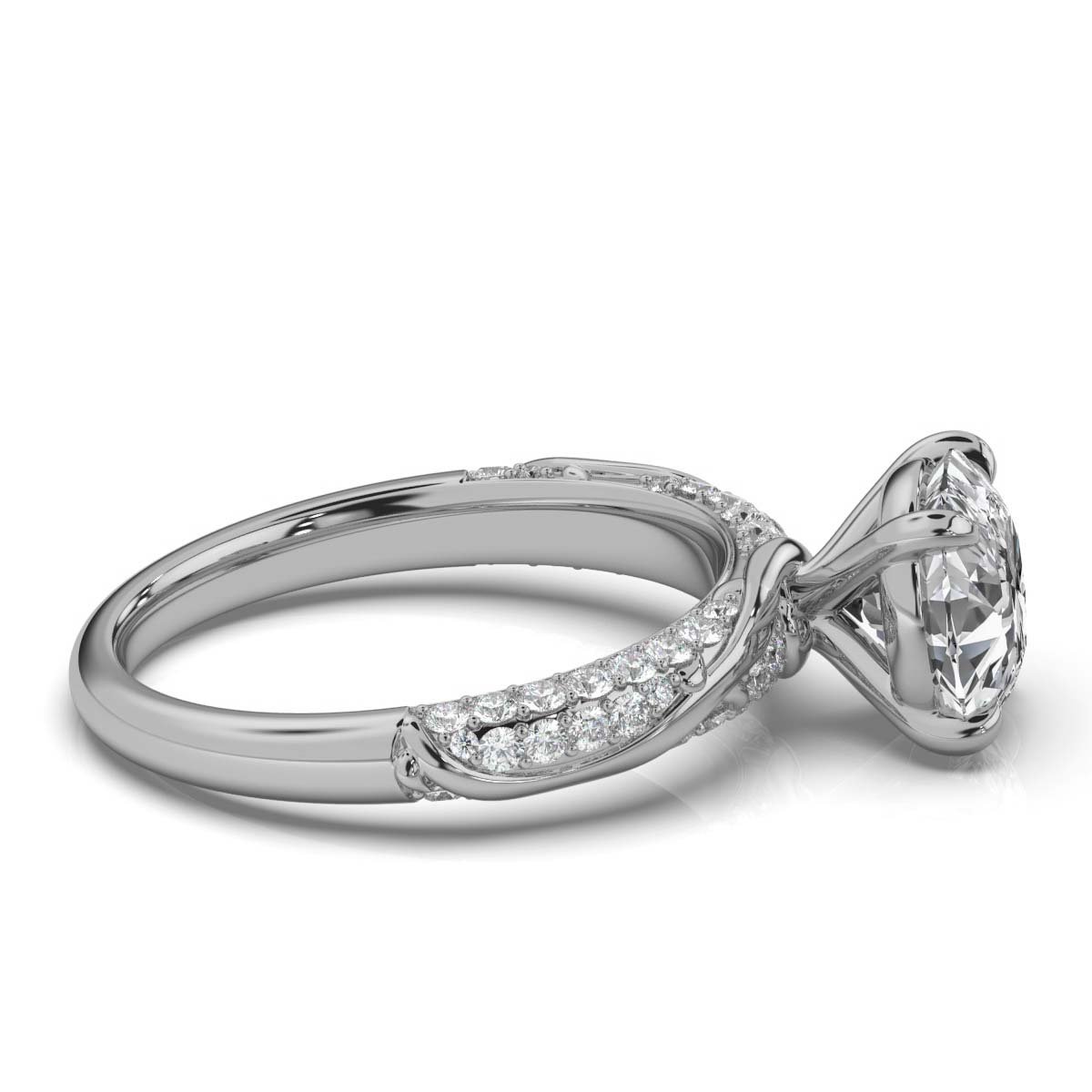 Exquisite three-stone engagement ring featuring a 2 ct round moissanite diamond with 0.42 ct pavé-set side stones. Available in white, yellow, and rose gold.
