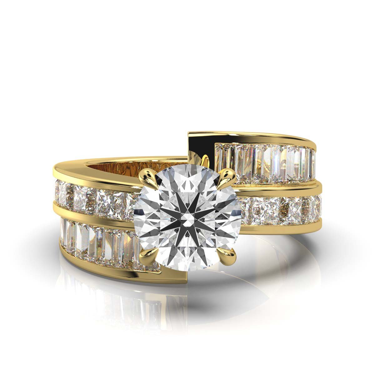 14K Solid Gold Round and Baguette Moissanite Diamond Engagement Ring