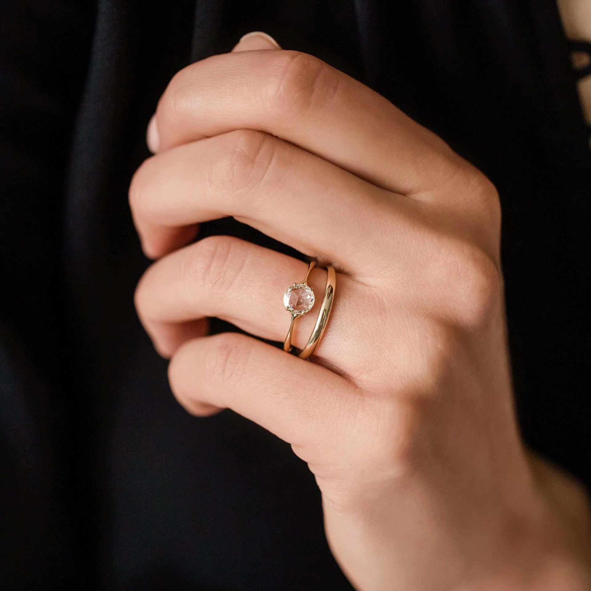 At its center, a 0.49-carat rose-cut Moissanite diamond captures light with a subtle yet mesmerizing brilliance. The rose cut, known for its old-world allure, showcases a unique flat base and domed top, making it an ideal choice for those who appreciate timeless designs. Whether worn as an engagement ring, a stackable piece, or a statement of personal style, its elegant simplicity makes it perfect for any occasion.