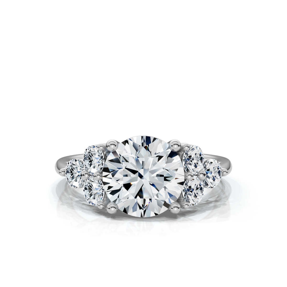 At its heart, a 2.00-carat round-cut Moissanite diamond takes center stage, radiating brilliance with its exceptional cut and fire. Complementing the centerpiece, six round-cut Moissanite side stones totaling 0.60 CTW enhance the sparkle, adding depth and dimension to this exquisite design. The sleek 1.5mm band width and height ensure a refined and comfortable fit, making it perfect for daily wear.