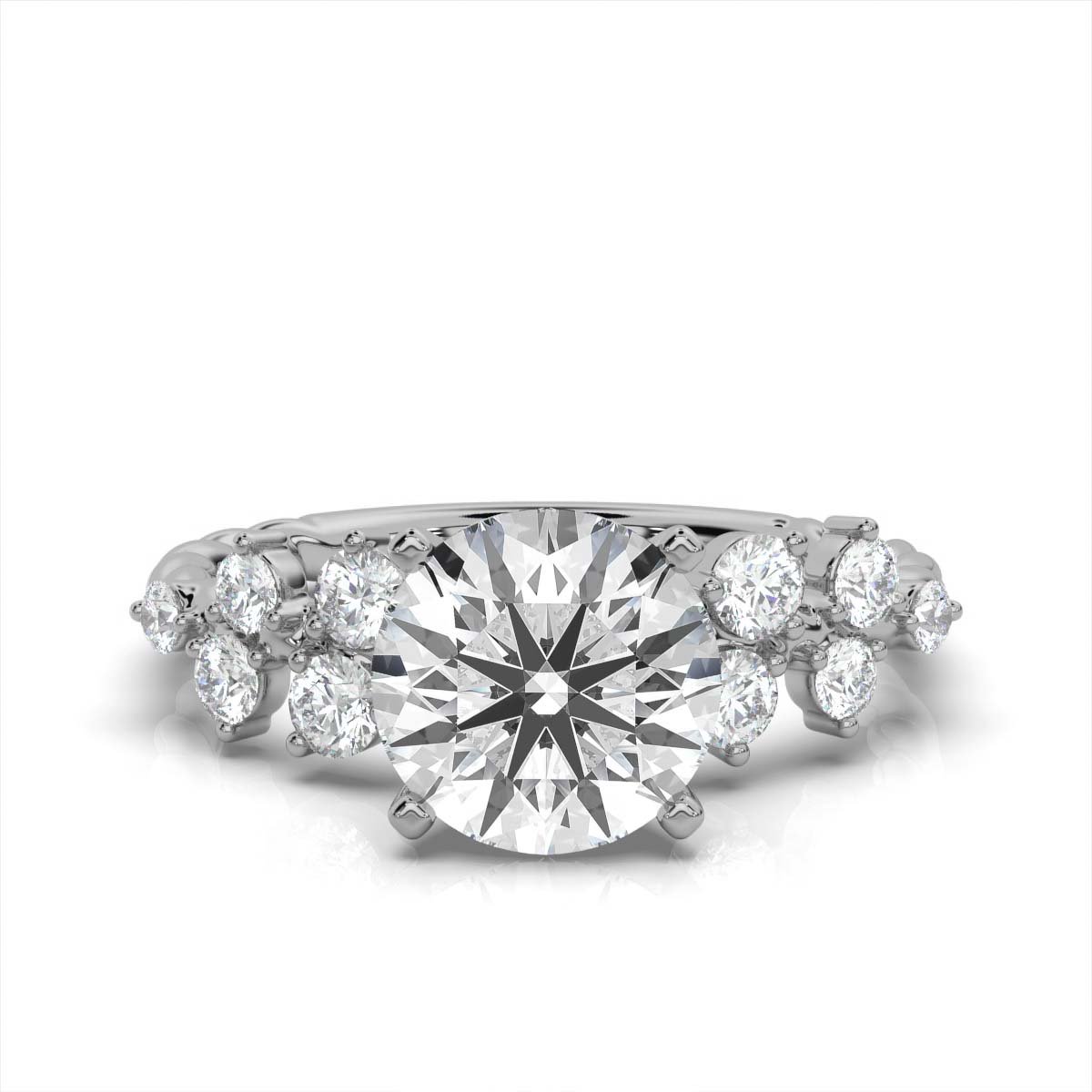 A 2 ct round lab-grown diamond ring with 10 side diamonds (0.36 ct total), set in 14K solid gold. A timeless and radiant symbol of love.