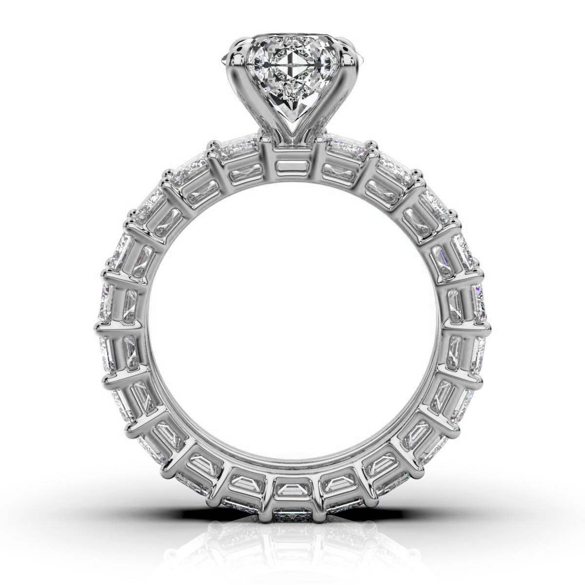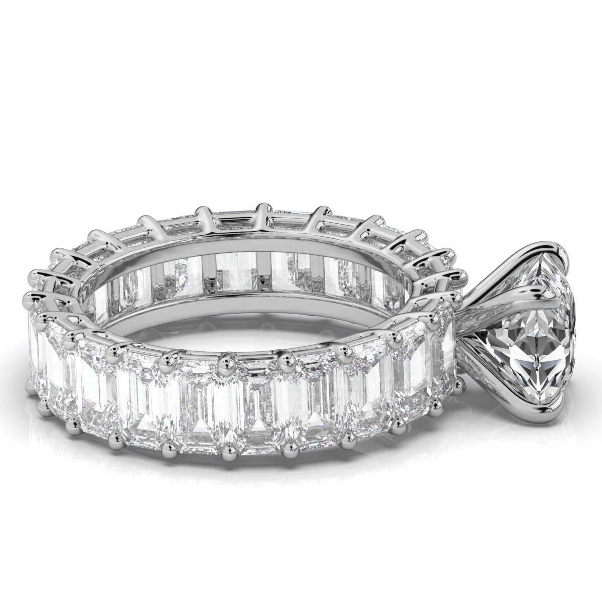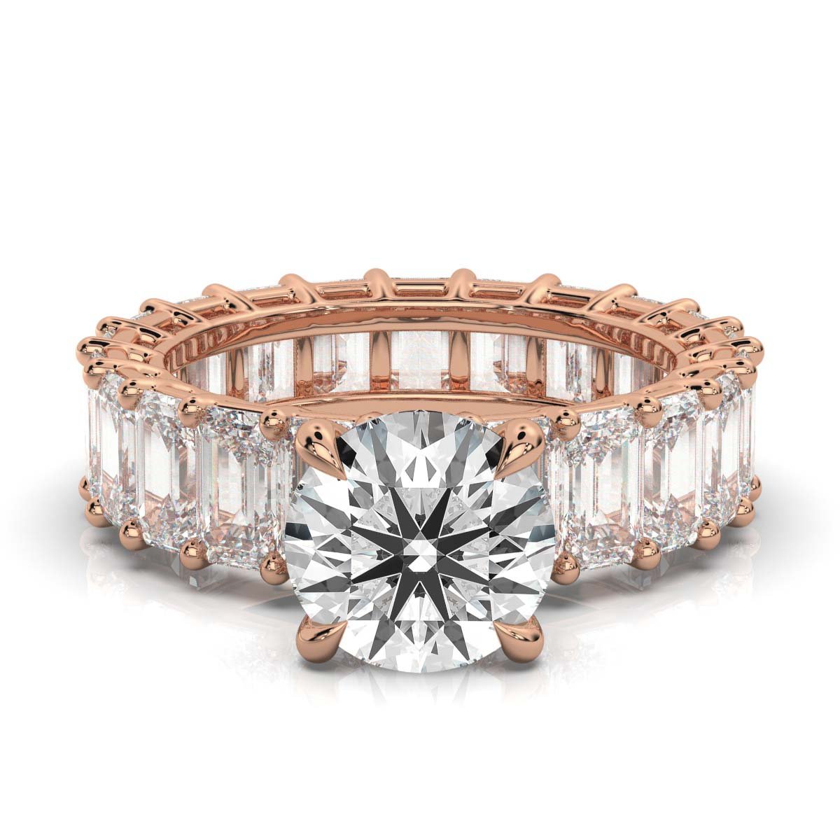 At the heart of this masterpiece sits a 2 ct round lab-grown diamond, graded F color, VS2 clarity, and Super Cut, radiating exceptional brilliance. Enhancing its beauty, 21 emerald-cut lab-grown diamonds totaling 6.09 ct elegantly frame the band, creating a mesmerizing contrast of shapes and sparkle.