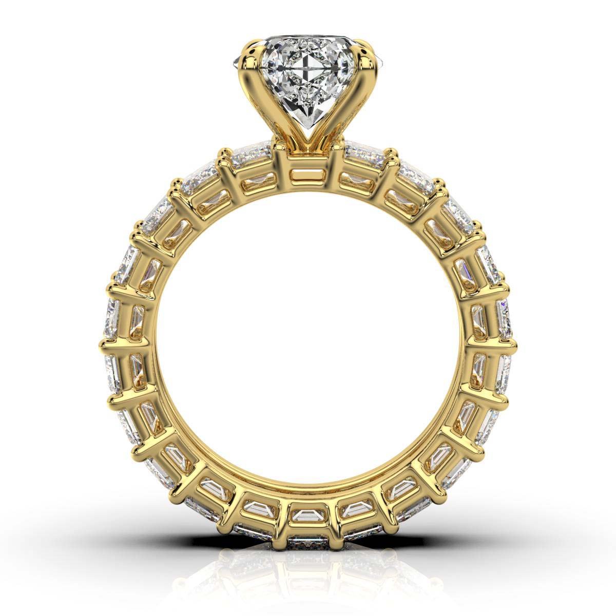 A 2 ct round lab-grown diamond ring with 21 emerald-cut side diamonds (6.09 ct total) in 14K gold. A luxurious statement piece, IGI & BIS certified.