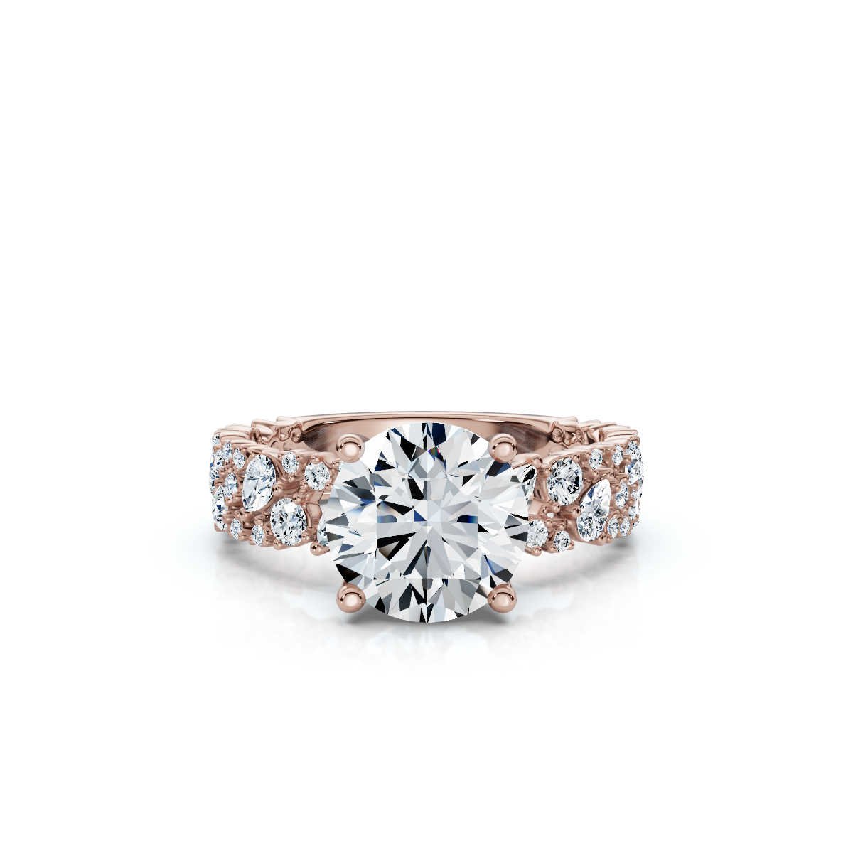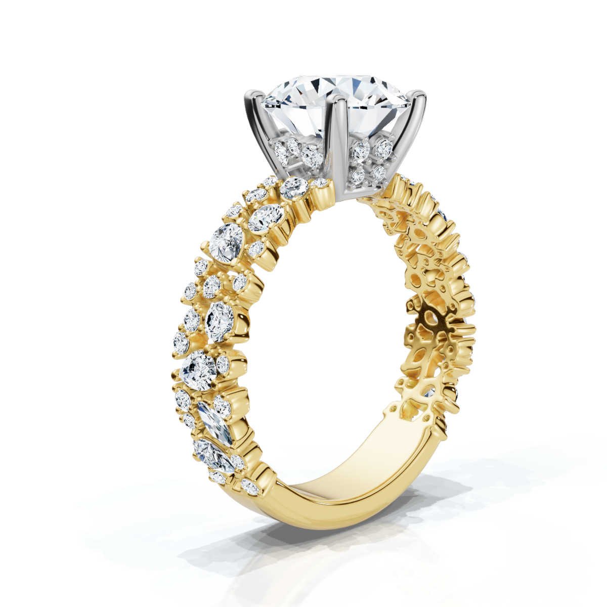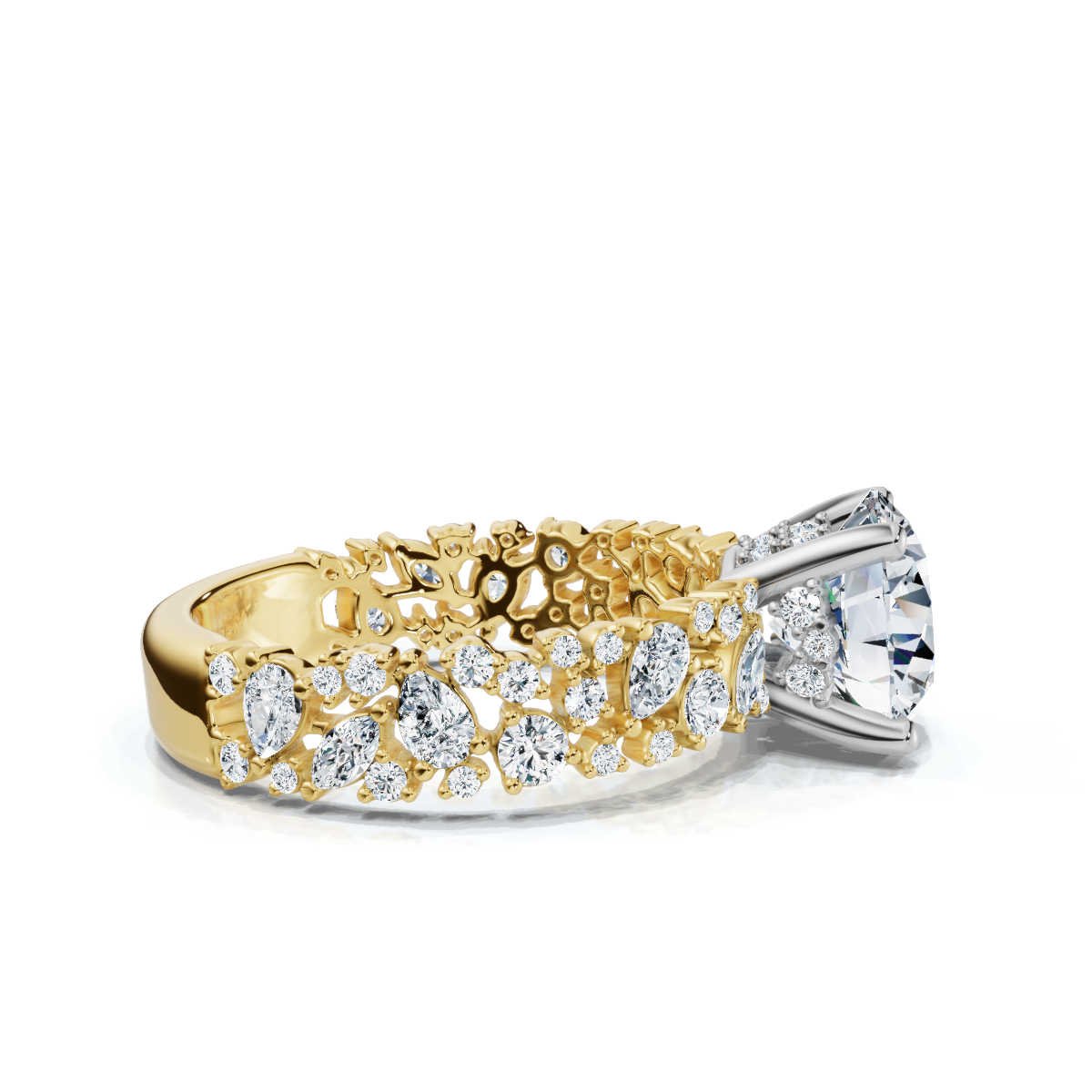 Enhancing its beauty, 64 meticulously set Moissanite side stones in round, marquise, and pear shapes (0.79ct total weight) surround the centerpiece, creating a mesmerizing play of light and brilliance. Crafted in solid 14K gold, this ring is available in White, Rose, and Yellow Gold, offering versatility to complement any personal style.