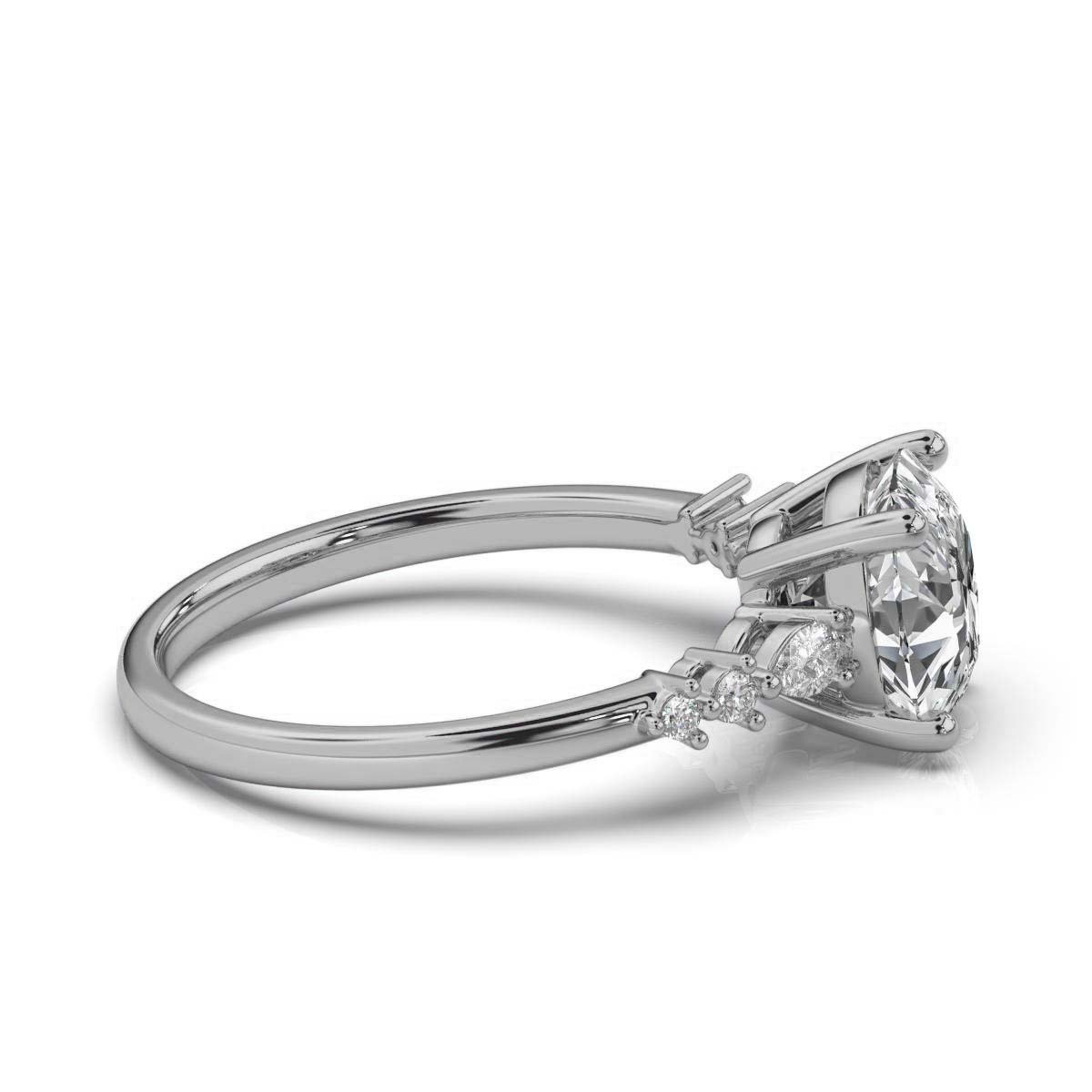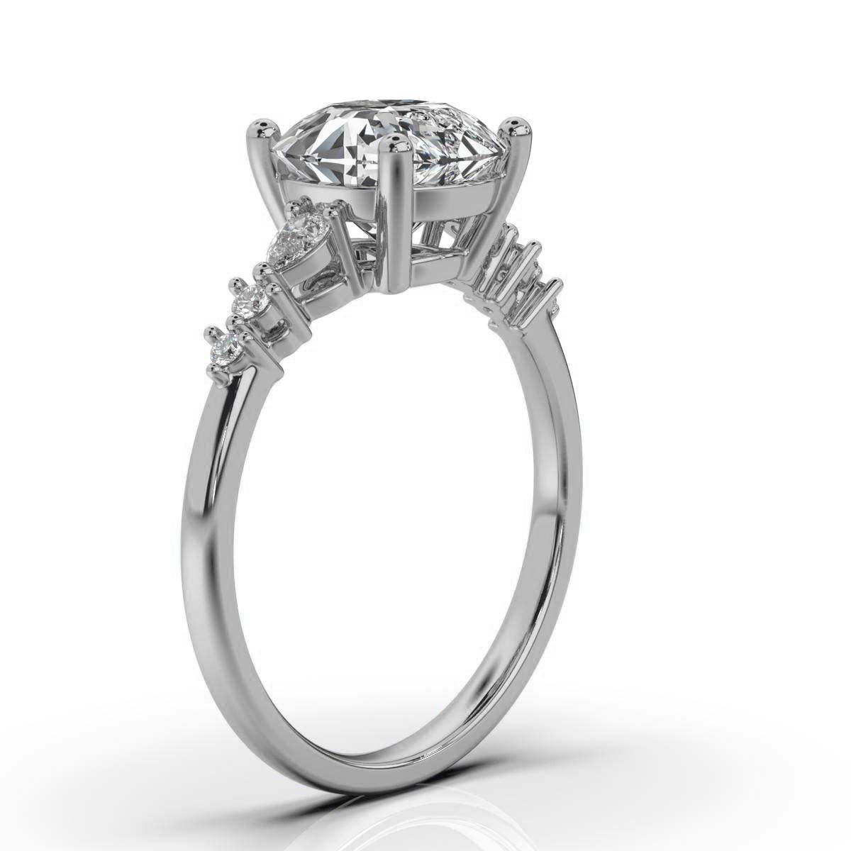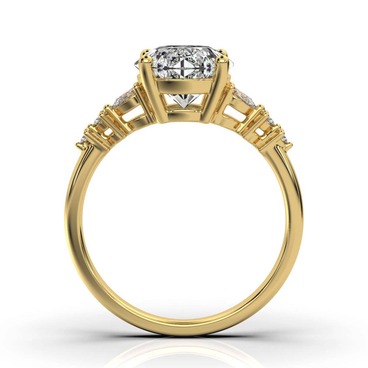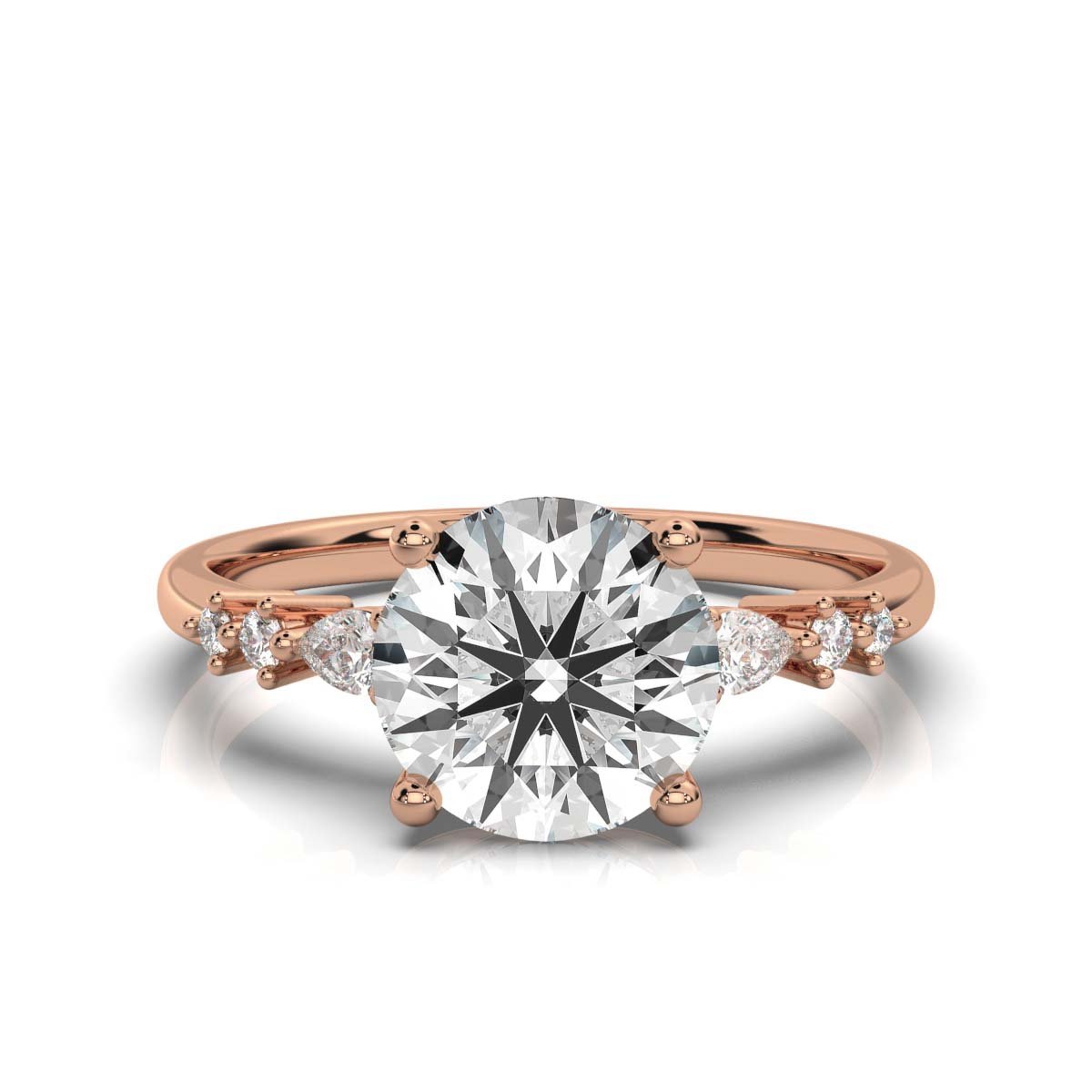 This 14K gold shared prong ring features a 2 ct round lab-grown diamond (F color, VS2 clarity, Super Cut) with six round and pear-shaped side diamonds (0.15 ctw) for added brilliance. Available in white, rose, or yellow gold.