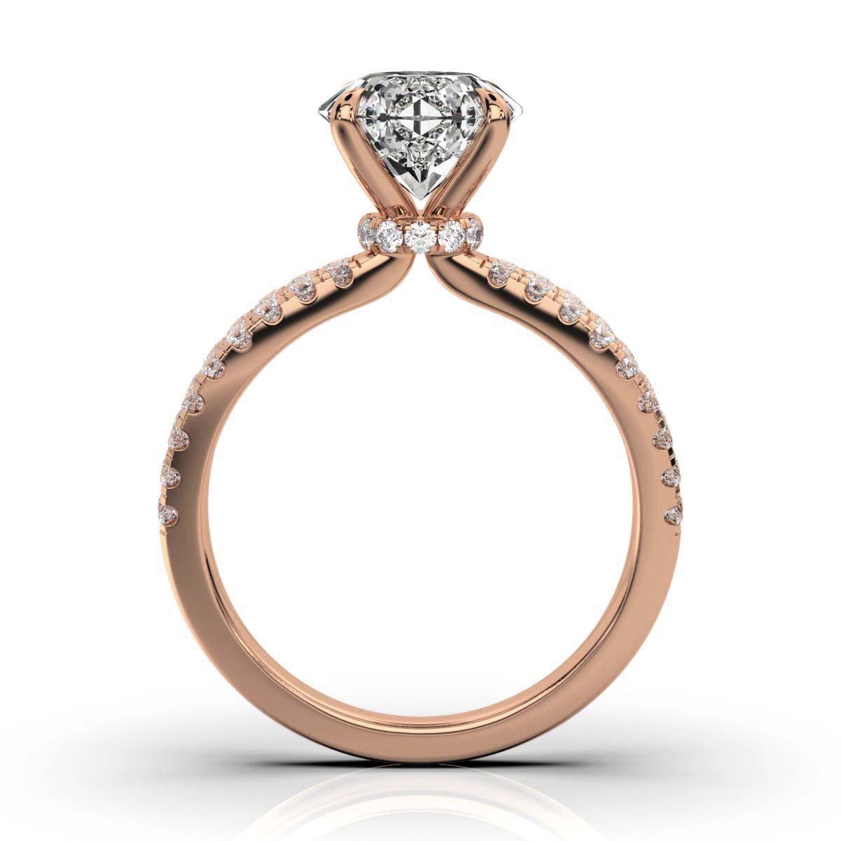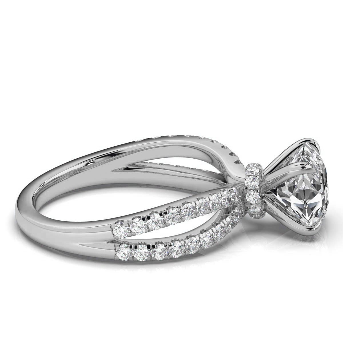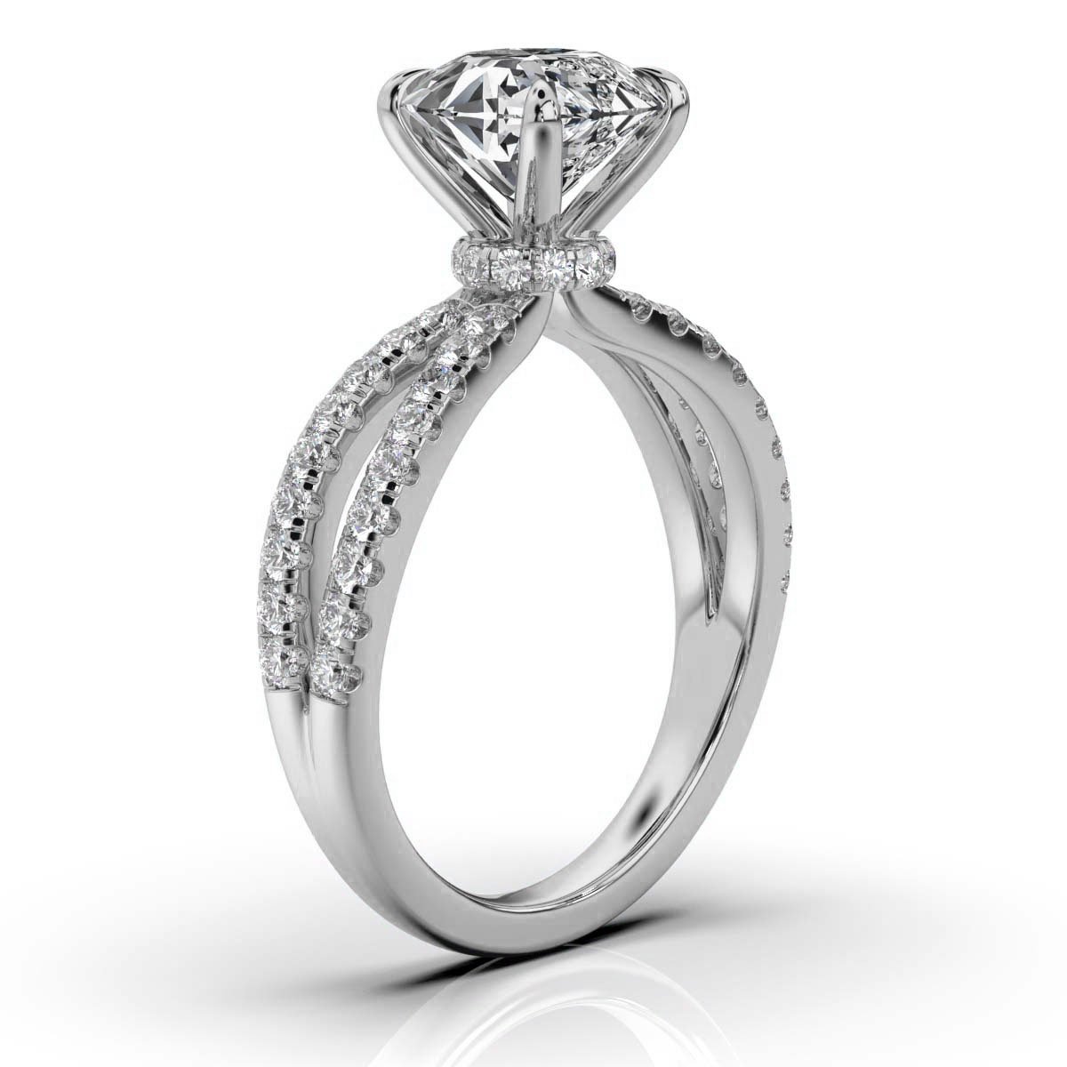 The split shank design enhances the ring’s brilliance, with 47 round Moissanite side stones (0.43 ctw) intricately set along the band, creating an eye-catching display of light. This unique setting not only adds glamour but also ensures a secure and comfortable fit.