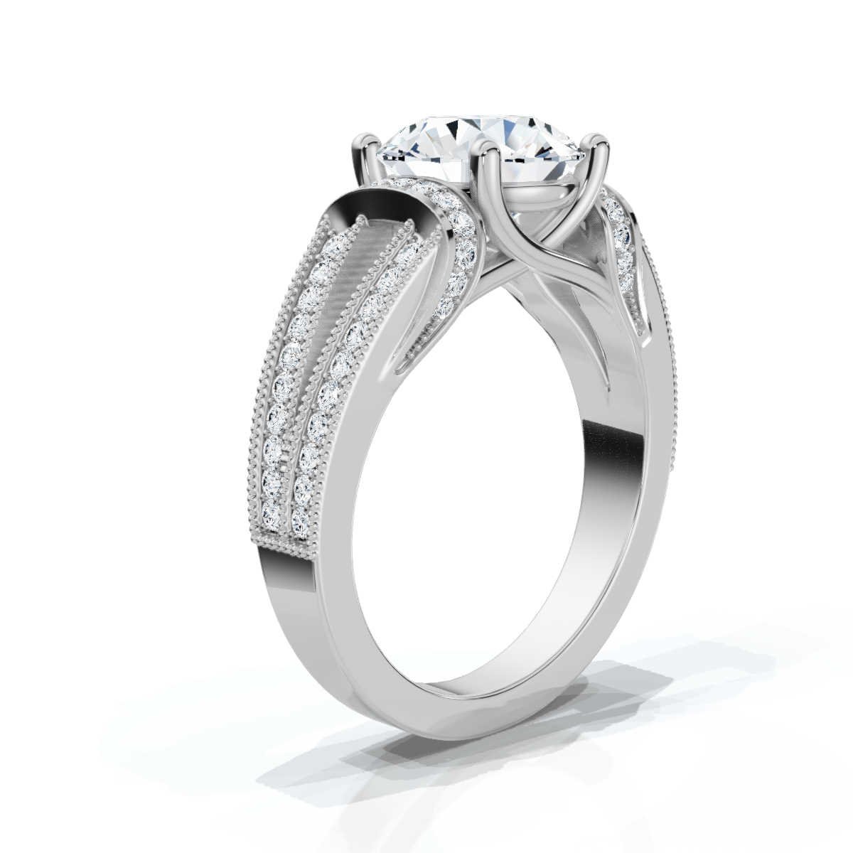 Complementing the center stone are 66 meticulously set round moissanite diamonds, adding a total of 0.32 carats to enhance the ring’s sparkle. The split shank design adds a modern touch, allowing light to reflect beautifully from every angle.