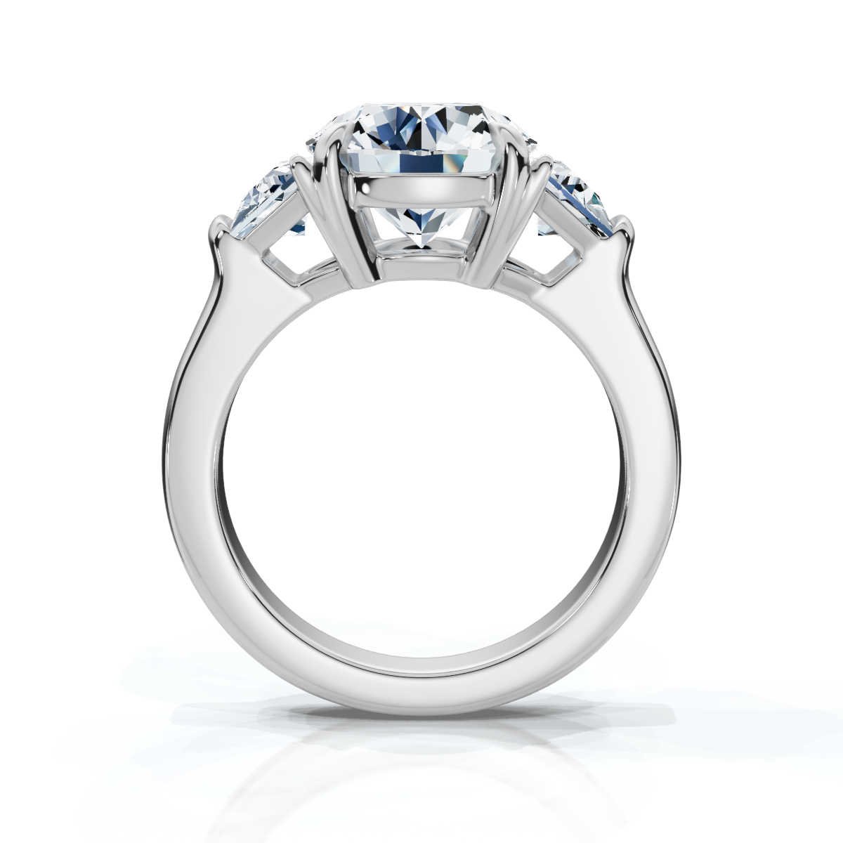 Flanking the centerpiece are two trapezoid-shaped Moissanite diamonds, contributing an additional 1.5 carats of sparkle and creating a captivating three-stone design. The band, crafted from 14K solid gold, is available in white, rose, and yellow gold, offering versatility to match any style. With a 2.4 mm width and 2 mm height, the ring provides a comfort fit, ensuring it feels as exceptional as it looks.