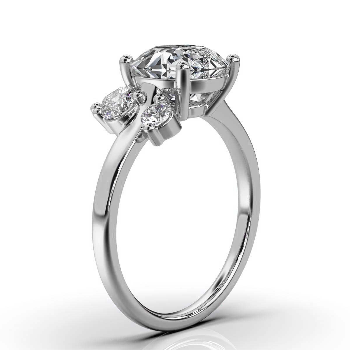 Flanking the center stone are two round moissanite side stones, adding a combined weight of 0.29 carats. These sparkling gems beautifully complement the centerpiece, symbolizing your past, present, and future together. The three-stone design represents the journey of love, capturing the essence of cherished memories and future promises.
