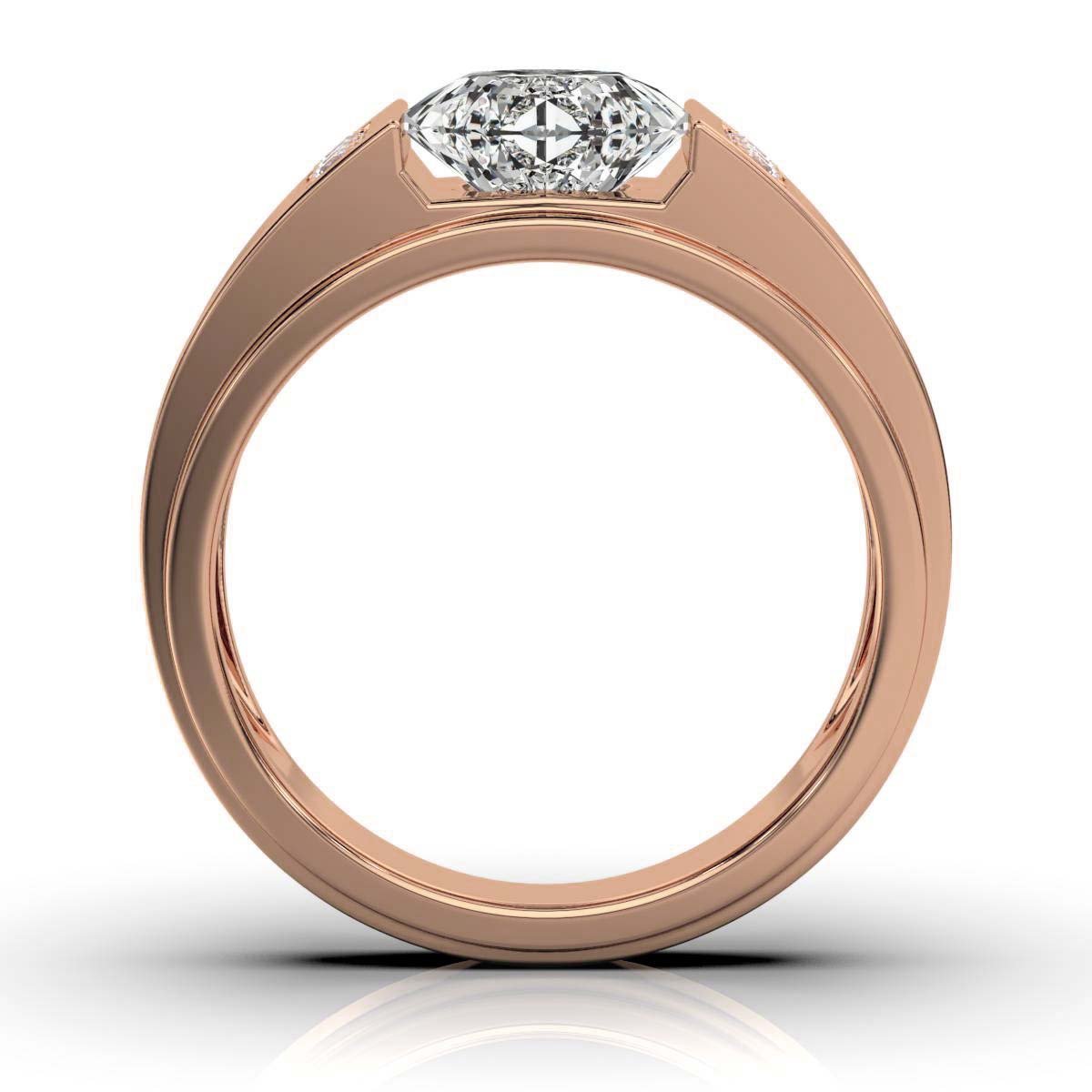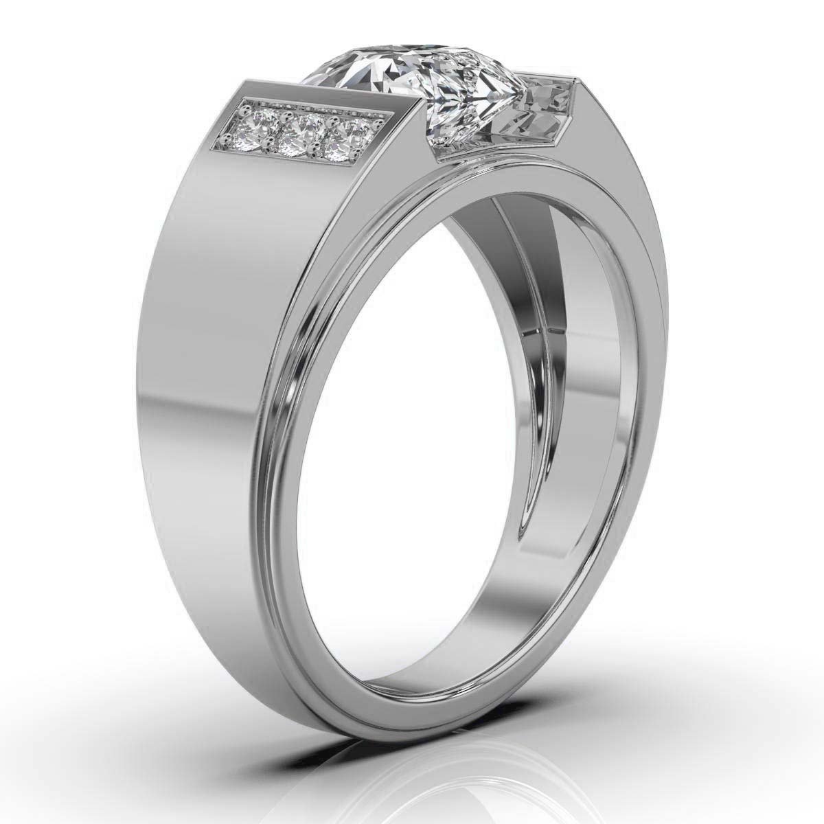 Flanking the center stone are six additional round Moissanite diamonds totaling 0.24ct, enhancing the ring’s brilliance with their exceptional clarity and precision-cut facets. The 3.5mm wide band, available in white, rose, or yellow gold, offers a bold, luxurious look while ensuring durability and comfort with its smooth, contoured fit.