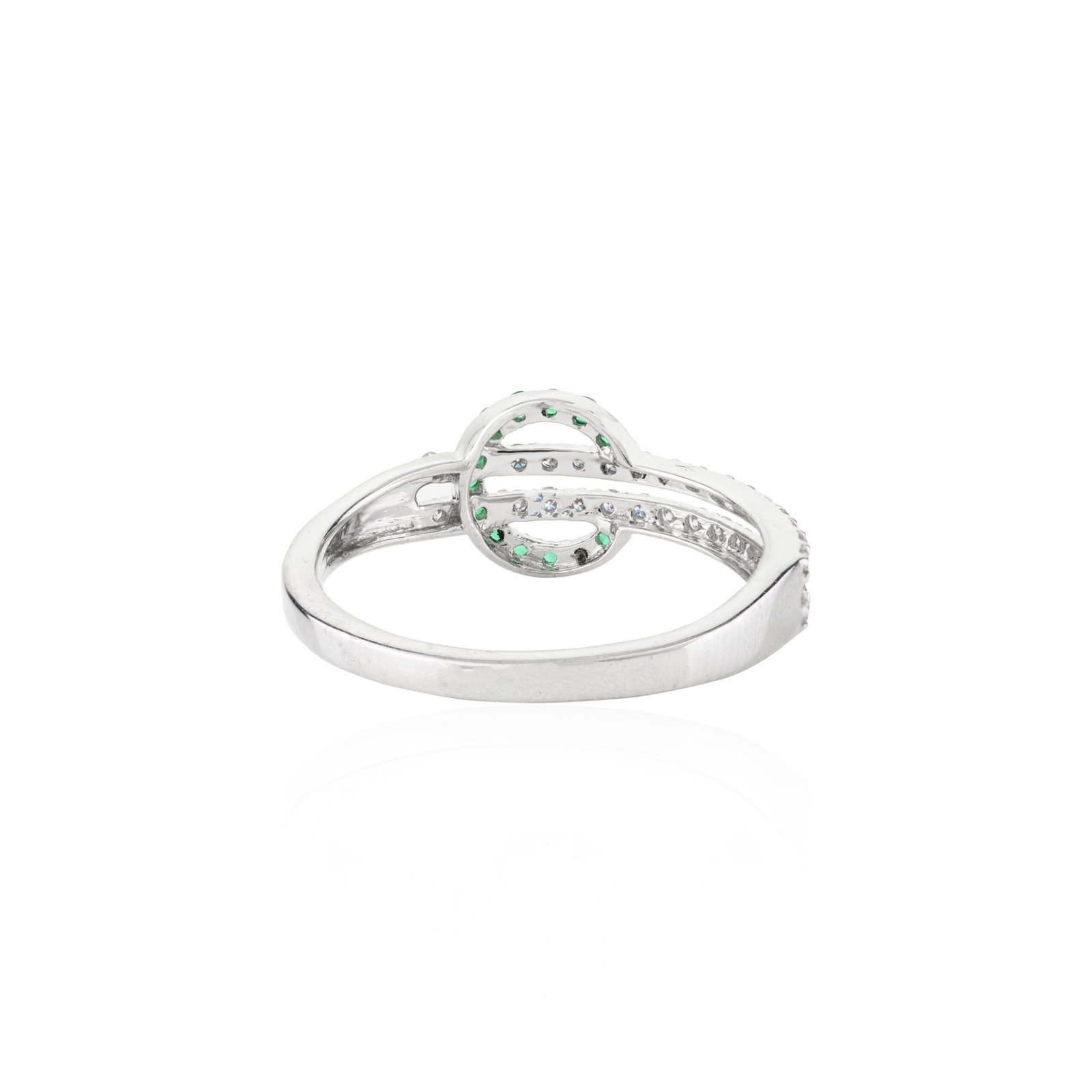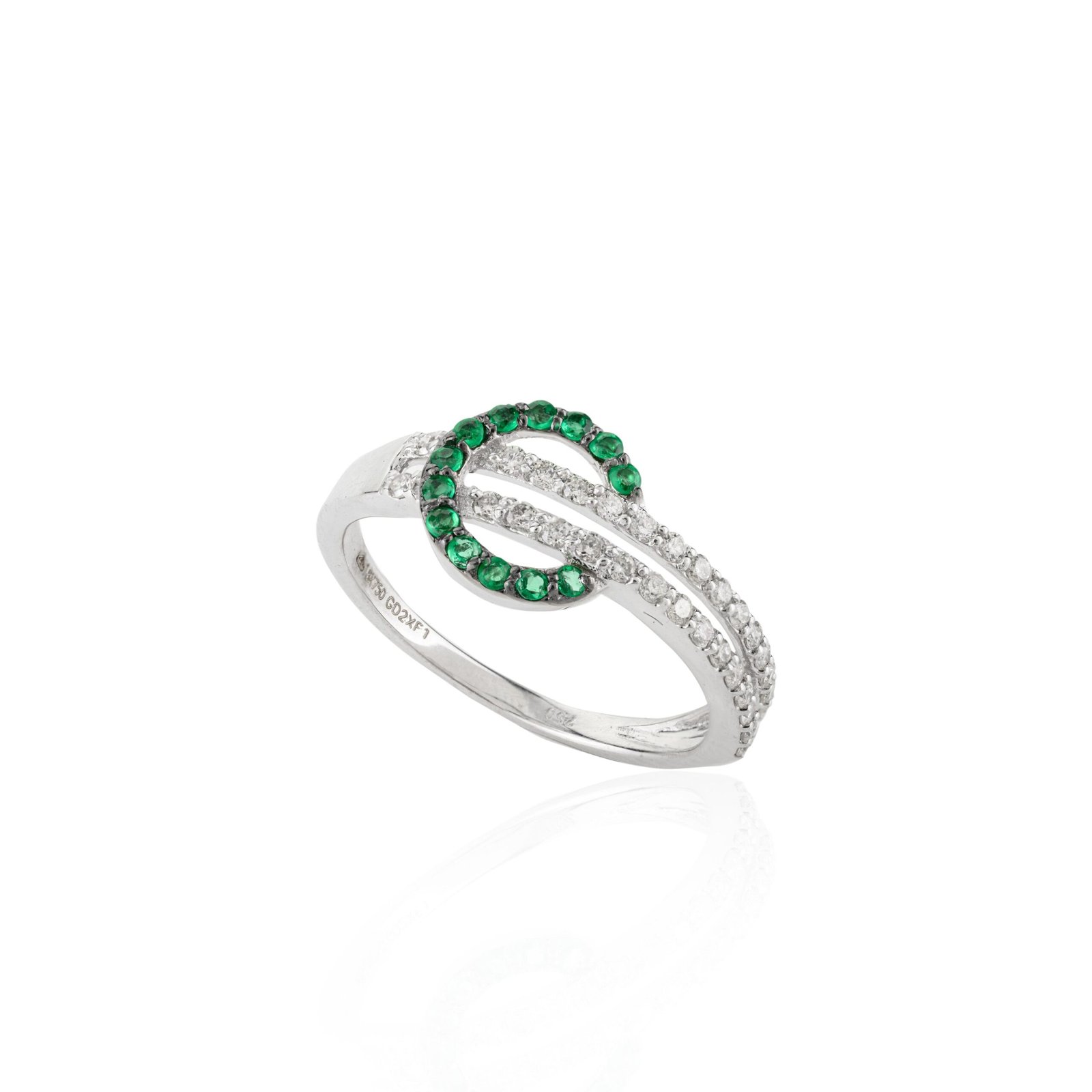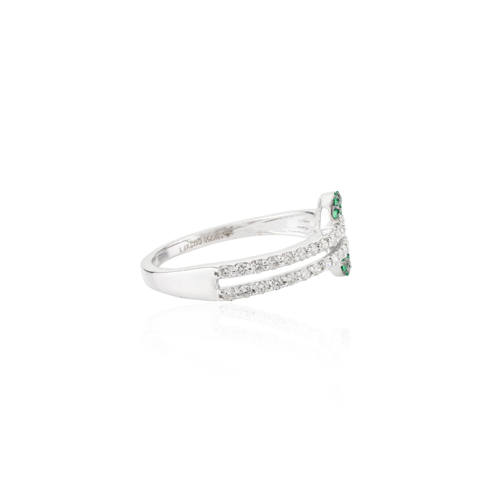The slender shank, measuring 1.7 mm in width, enhances the ring’s elegant silhouette and ensures comfortable wear throughout the day. Each gemstone is meticulously set to maximize its sparkle and color, showcasing the natural beauty of emeralds and diamonds against the polished white gold backdrop.
