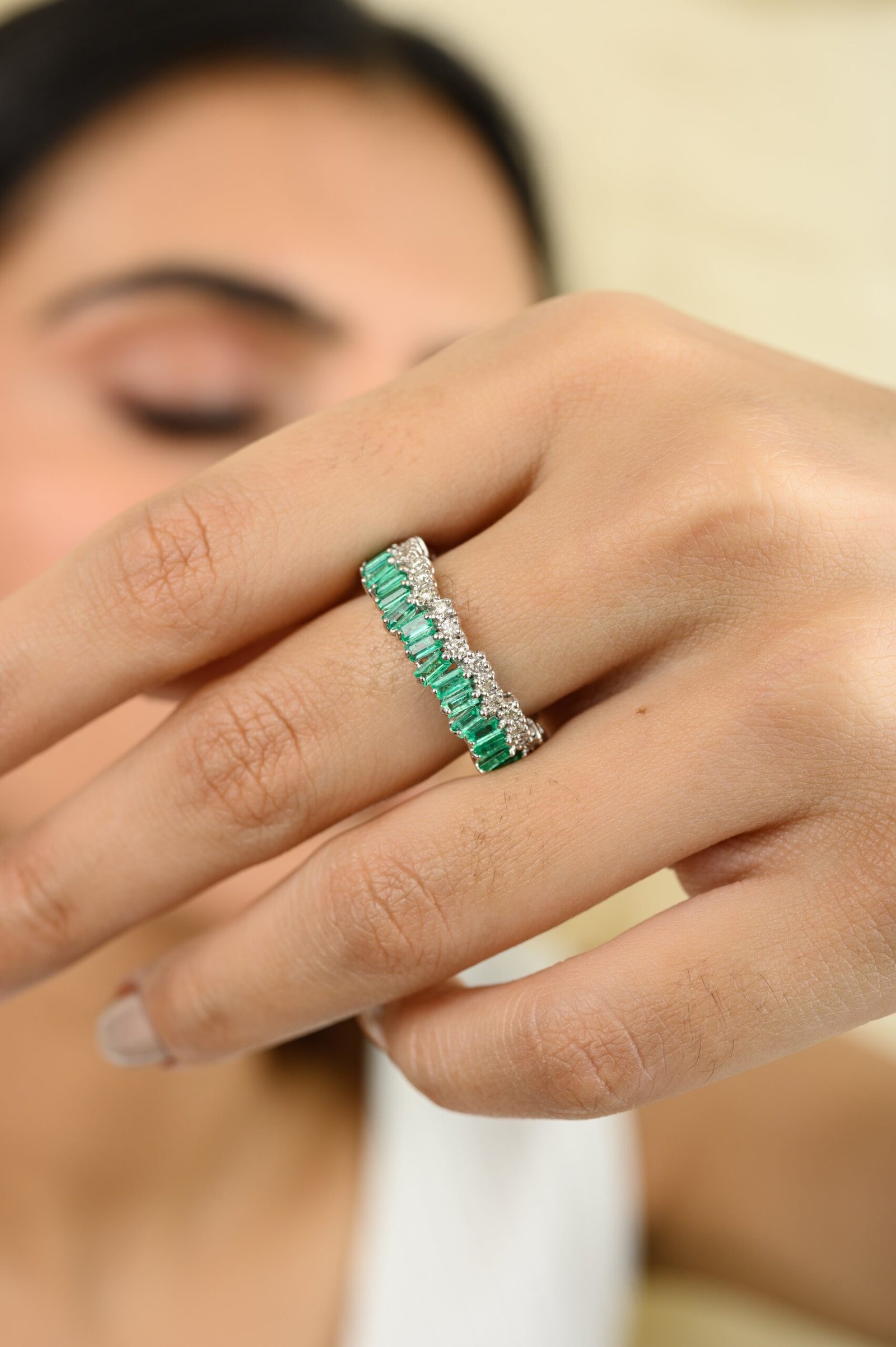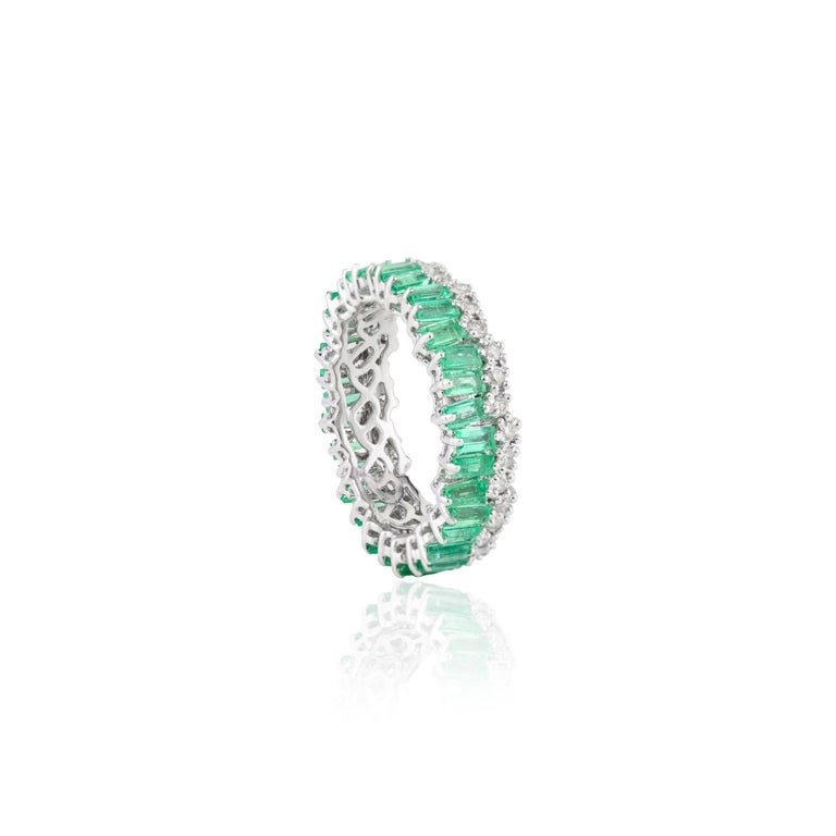 Crafted from high-quality 14K solid gold, this eternity band features a stunning combination of emeralds and diamonds. The band is adorned with baguette-cut emeralds totaling 1.83 carats, each emerald carefully set to create a seamless and continuous design. Accompanying the emeralds are diamonds weighing 0.495 carats, adding a touch of brilliance and sparkle to the band.