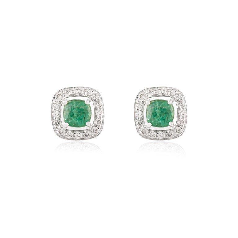 Crafted from 14K solid white gold, these earrings feature a vibrant emerald center stone, weighing a total of 2.63 carats. Each emerald, measuring 6.5 x 6.5 mm, is expertly cut to enhance its brilliant green hue. Surrounding each emerald is a halo of dazzling diamonds, with a total diamond weight of 0.82 carats. The diamonds, each measuring 1.5 mm, add a sparkling frame that enhances the overall allure of the earrings.