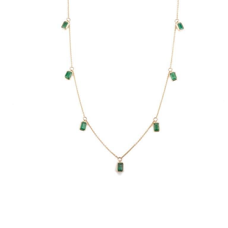 Crafted from 14K solid gold, this necklace features seven vibrant emeralds, with a total gemstone weight of 4.06 carats. Each emerald measures 7 x 5 mm, showcasing their brilliant green hue and expert cut. The emerald charms are evenly spaced along the 17.5-inch chain, creating a balanced and harmonious look.