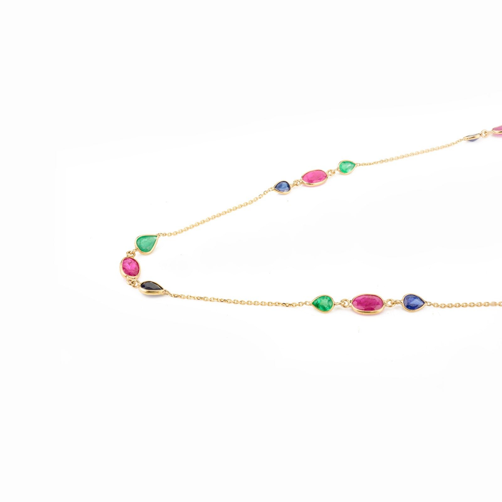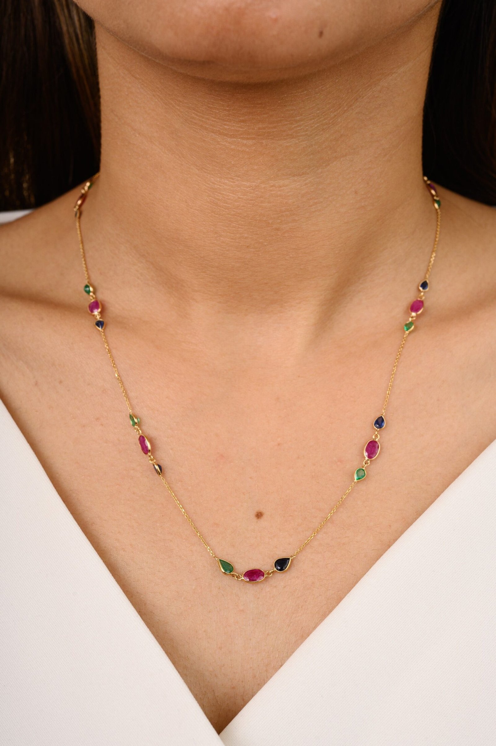 Elevate your style with the vibrant beauty of the 14K Solid Gold Multi Gemstone Station Necklace, meticulously crafted from luxurious 14K solid gold. This exquisite necklace features a variety of gemstones including emeralds, rubies, and sapphires, totaling 1.07 carats. The gemstones are cut in different sizes and shapes, ranging from 3.3 x 3.8 mm to 4.3 x 5.2 mm, and are spaced evenly along the chain to create a stunning station design.