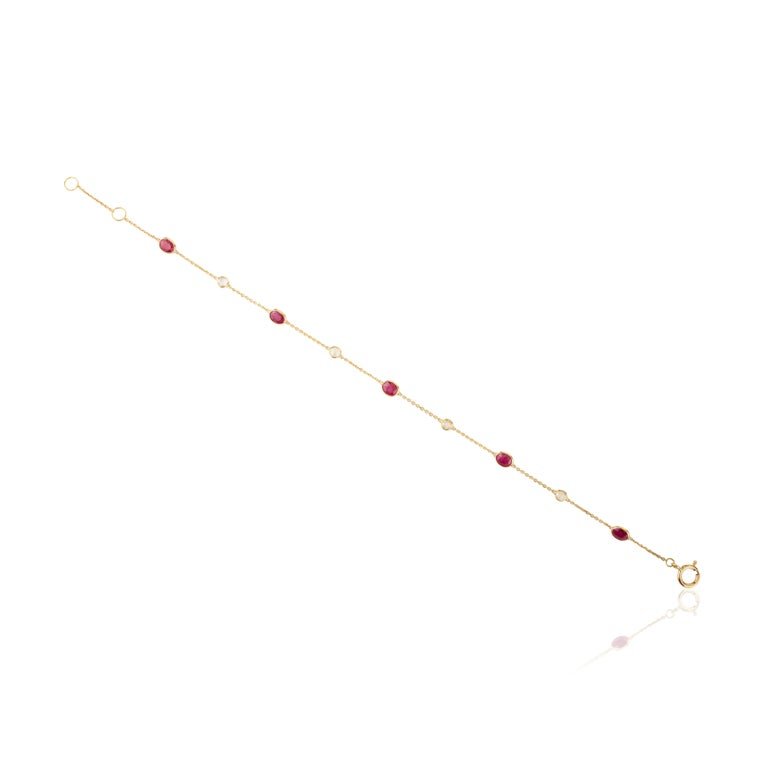 Crafted from high-quality 14K solid yellow gold, this bracelet features a stunning combination of rubies and diamonds. The bracelet showcases rubies with a total weight of 0.32 carats, each measuring 4 x 4.2 mm, and four diamonds with a total weight of 0.05 carats, each measuring 3 mm. The vibrant red rubies and sparkling diamonds create a striking contrast against the warm yellow gold, making this bracelet a captivating addition to any outfit.