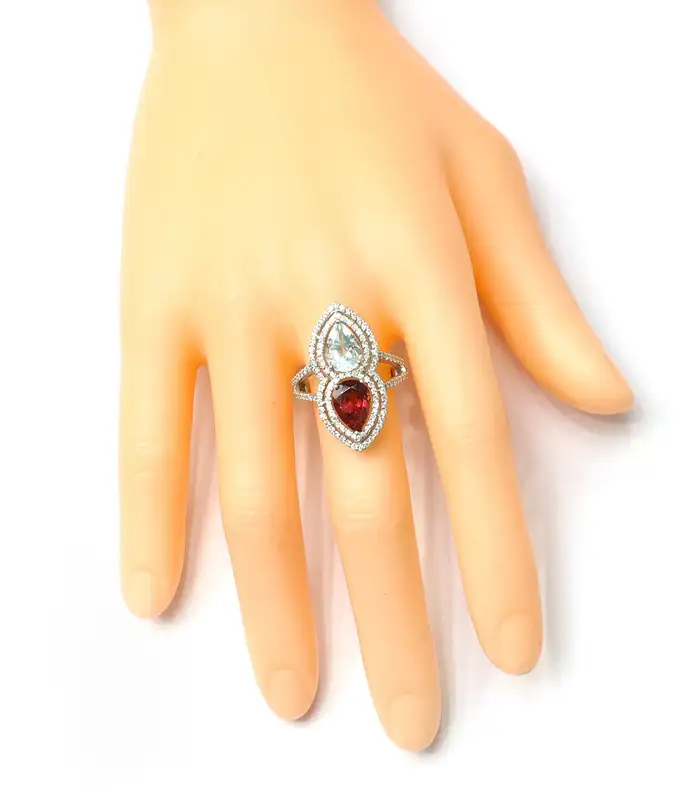 Bold 14K solid gold ring featuring 4.59 carats of aquamarine, tourmaline, and diamonds—crafted for vibrant elegance and artistic sophistication.