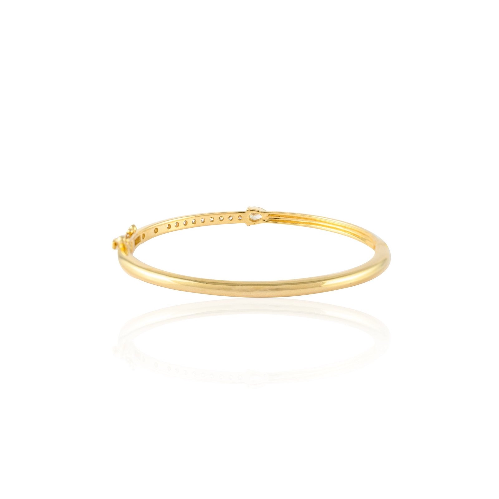 The bangle is accented with a series of sparkling diamonds, totaling 0.13 carats. These diamonds are carefully prong-set into the bangle, ensuring they are securely held in place while allowing them to catch and reflect light beautifully. Each diamond measures 3.5 x 6 mm, adding a touch of brilliance that elevates the overall design of the piece.