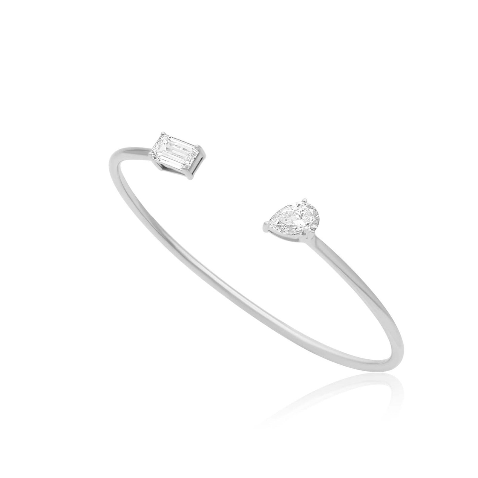 Elevate your jewelry collection with the 18k Gold Pear and Baguette Bangle, a stunning fusion of elegance and brilliance. This exquisite piece features 0.97 carats of pear-shaped Moissanite diamonds and 0.91 carats of baguette-cut Moissanite diamonds, all set in luxurious 18k white gold. The combination of the classic pear and baguette cuts creates a sophisticated contrast, offering a timeless yet modern aesthetic.