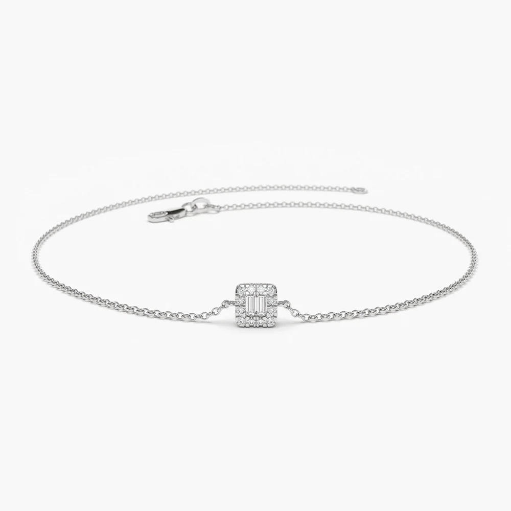 The 18k Gold Tiny Baguette and Round Moissanite Diamond Station Bracelet is a delicate yet radiant piece, perfect for elevating your everyday style. Expertly crafted from 18k Solid Gold in your choice of white, rose, or yellow gold, this bracelet features an elegant mix of tiny baguette and round moissanite diamonds, creating a sophisticated station design.