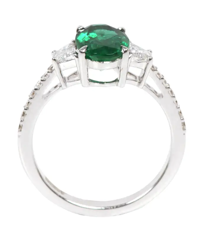 With a total weight of 1.72 carats of emeralds, the centerpiece is surrounded with sparkling diamonds weighing 0.48 carats and creates a stunning contrast capturing the eye.