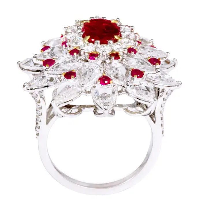 Expertly crafted from 18k solid gold, this cocktail ring is available in white, rose, or yellow gold to suit your personal style. With a substantial gross weight of 10.91 grams, including 9.12 grams of gold, this ring is a masterwork of balance and boldness. The center of attention lies in the breathtaking combination of 7.01 carats of natural diamonds and 1.94 carats of deep red rubies, meticulously set to create a dramatic contrast and captivating sparkle.