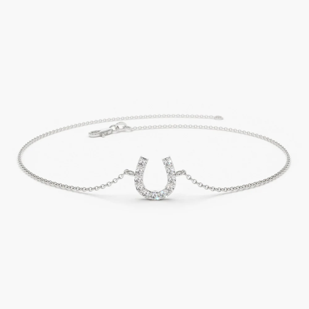 The 18k Solid Gold Mini Moissanite Diamond Horseshoe Bracelet is a symbol of luck and elegance, designed for those who appreciate timeless sophistication. Crafted from premium 18k Solid Gold, available in white, rose, or yellow gold, this bracelet features a delicate horseshoe charm adorned with shimmering moissanite diamonds.