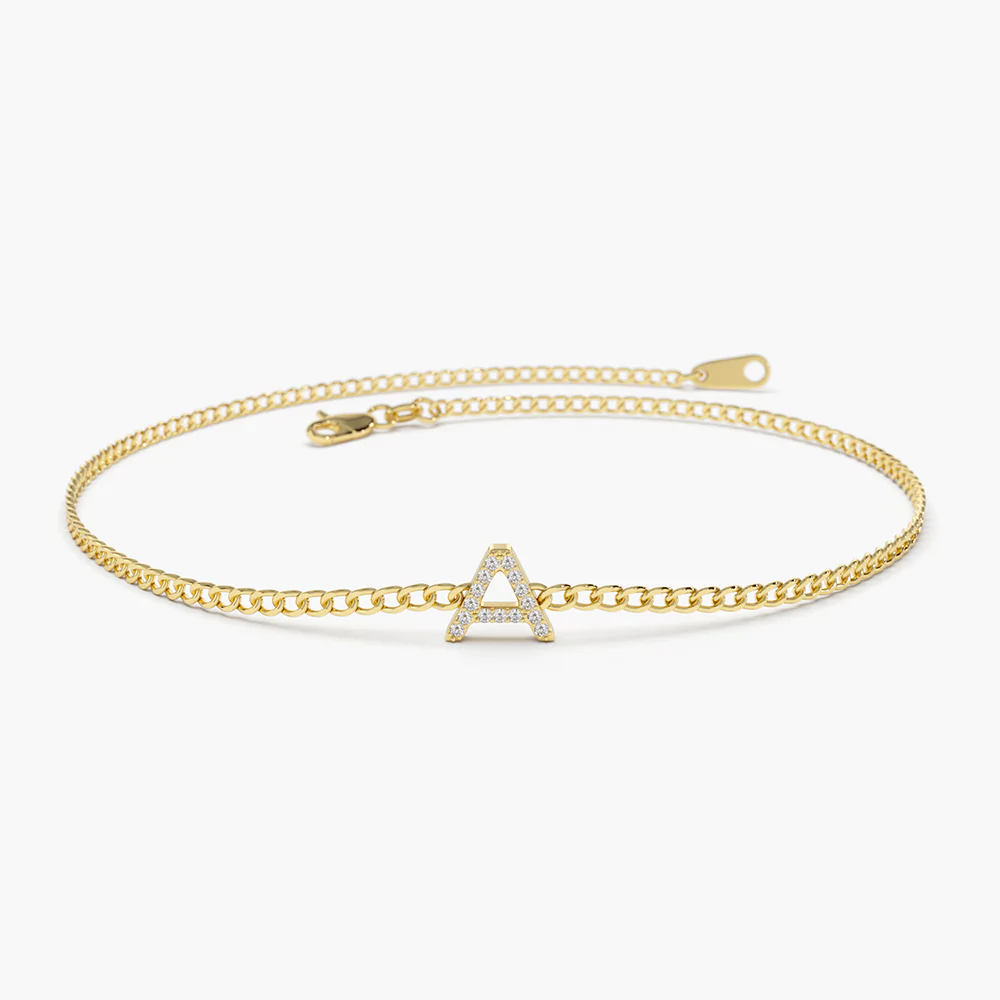 18k Solid Gold Moissanite Diamond Initial Curb Bracelet
