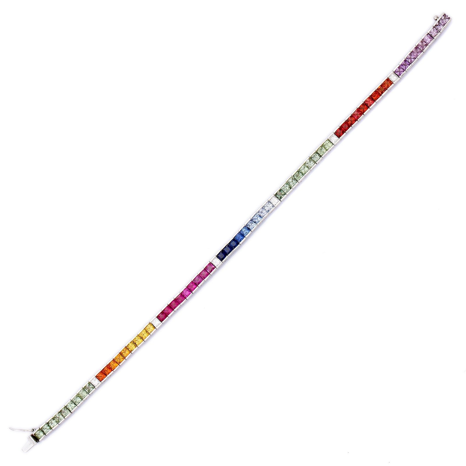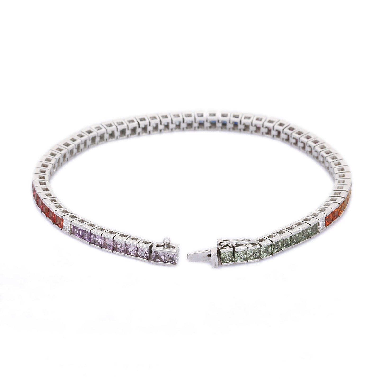 Embrace the allure of color and brilliance with the 18k Solid Gold Multi Sapphire Diamond Bracelet, a captivating piece that combines the timeless elegance of diamonds with the vibrant hues of multi-colored sapphires. Crafted from luxurious 18k solid gold, this bracelet features square-cut multi-colored sapphires totaling 7.85 carats. Each sapphire exhibits its own unique blend of colors, ranging from deep blues to vivid greens and rich yellows, creating a kaleidoscope of brilliance.