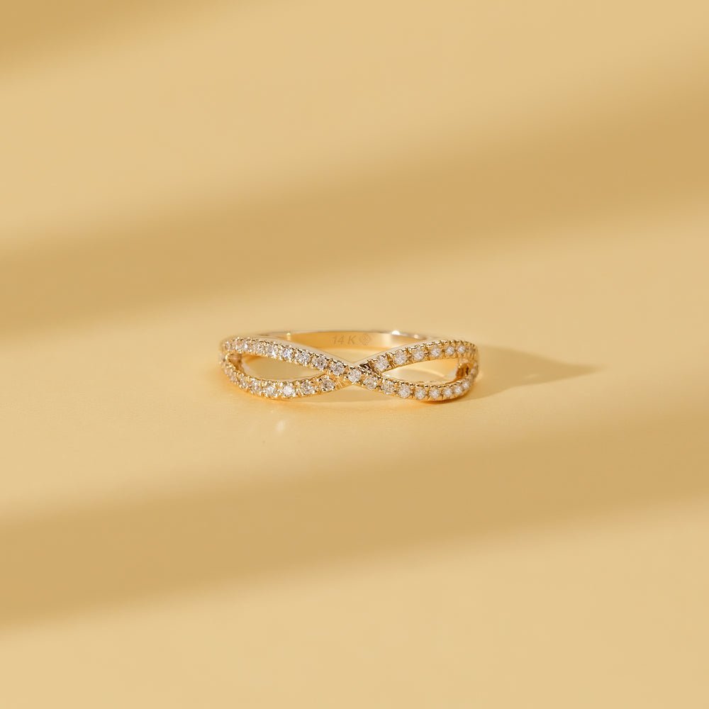 18k Solid Gold Crossover Ring featuring 0.34 ctw of GH VS-SI diamonds. A modern, elegant design with BIS and GIA certification.