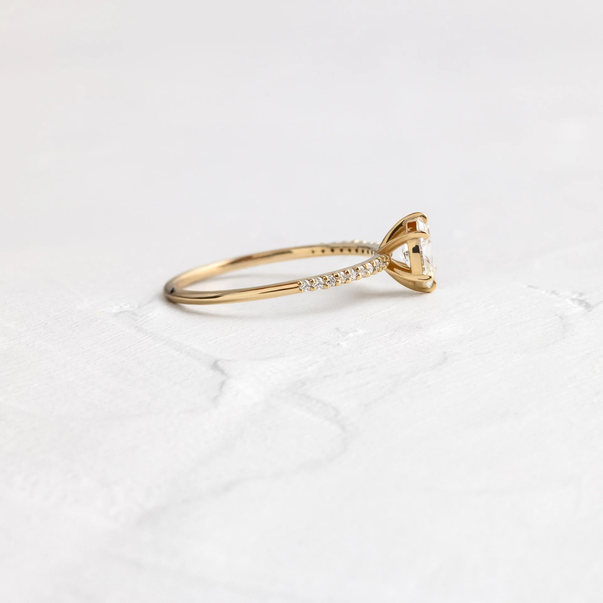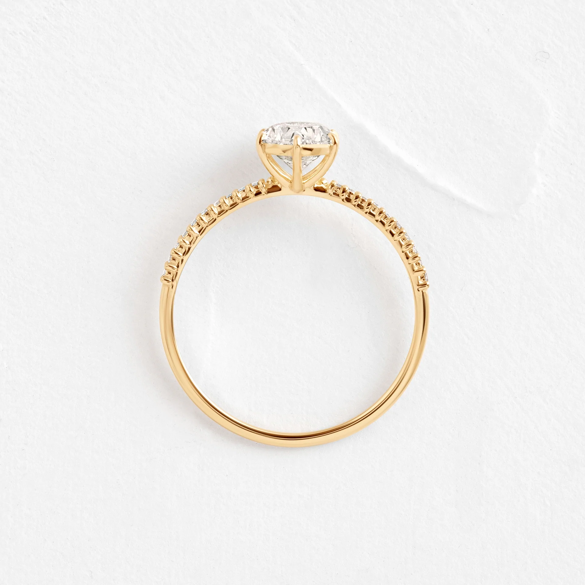 The pave band, set with smaller lab-grown diamonds, gives a layer of intricate shimmer that complements the center diamond perfectly. This is a luxurious ring perfect for those who appreciate elegance and sustainability.