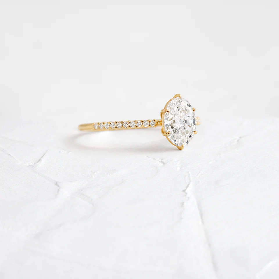 This is a stunning 1.5 carat oval-cut lab-grown diamond in an elongated shape, which brings out unbelievable brilliance, and it’s made from high-quality 18k gold.