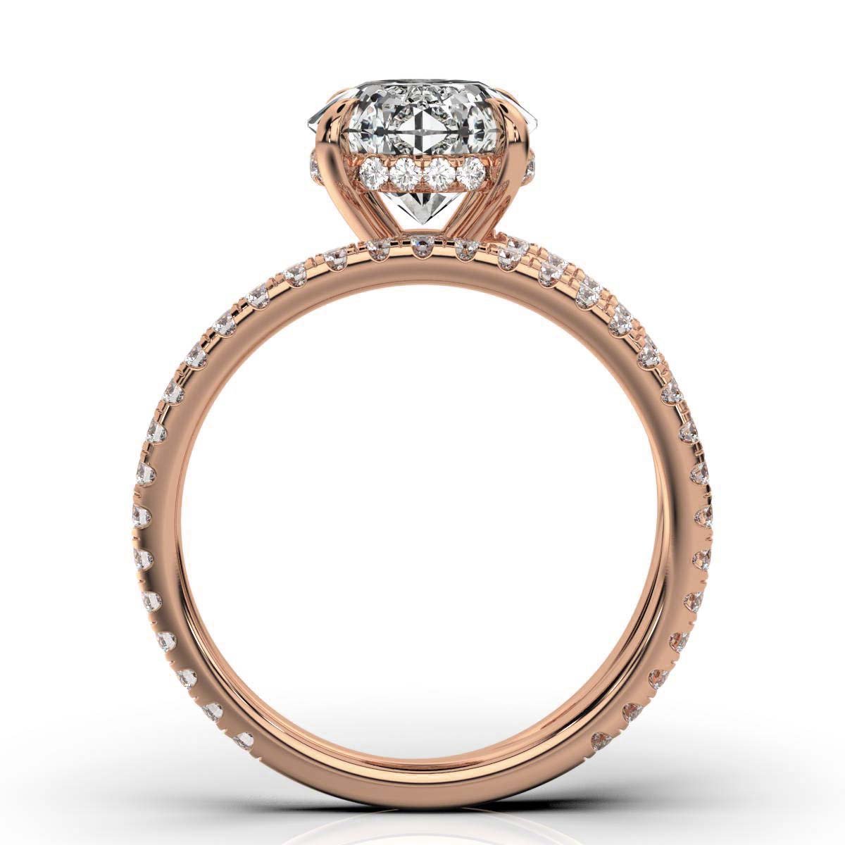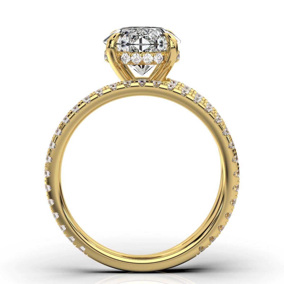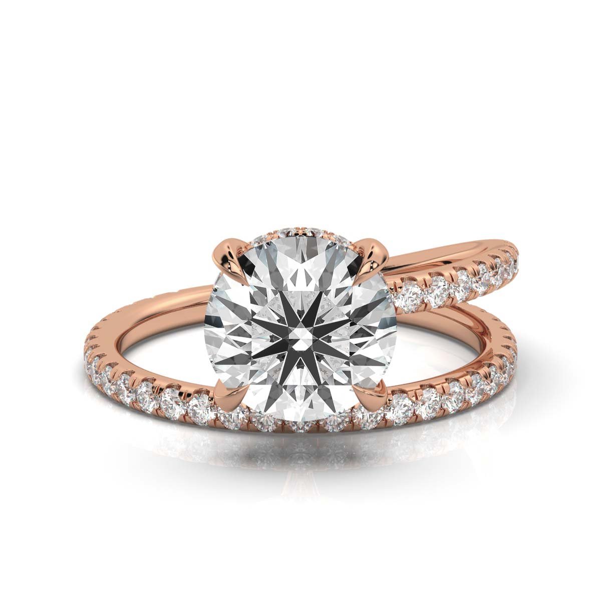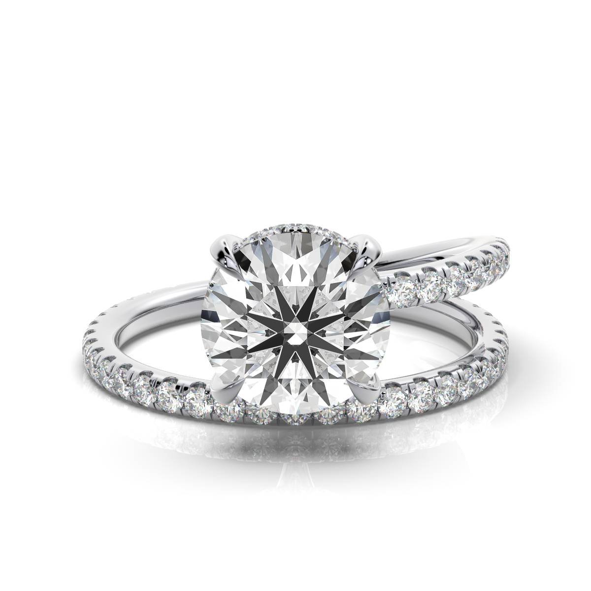 At its heart lies a 2 ct round lab-grown diamond, boasting F color, VS2 clarity, and Super Cut grading, ensuring unmatched sparkle and brilliance. Surrounding the center stone, 64 round lab-grown diamonds (0.68 ct total) adorn the exquisite split shank, adding a dazzling accent to the design.