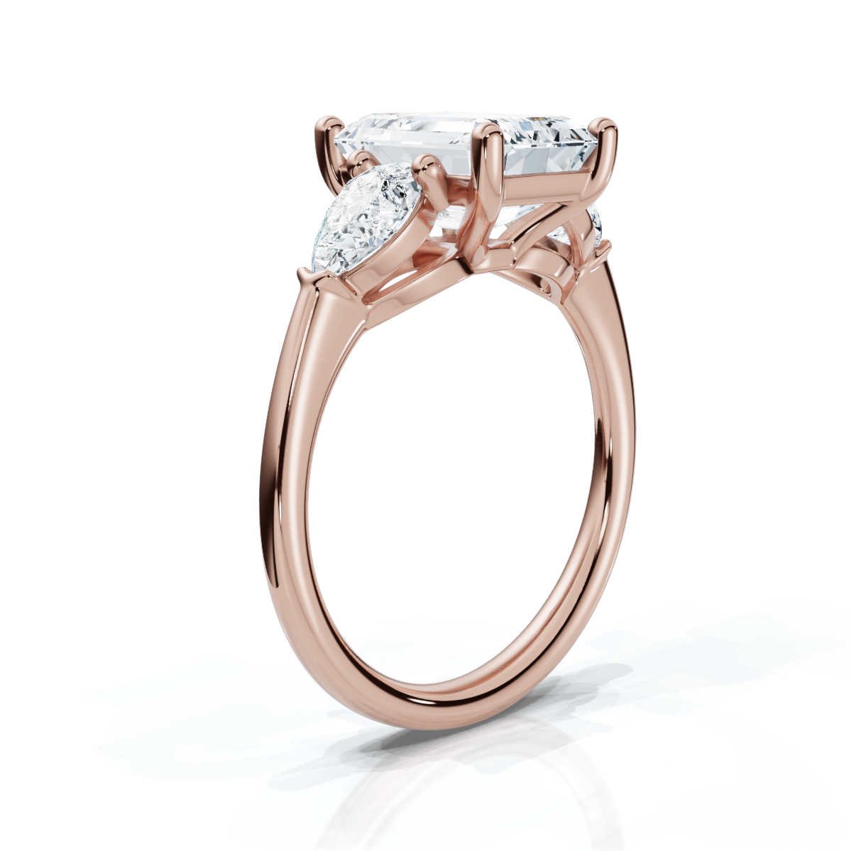 A stunning 18k solid gold three-stone ring with a 2ct emerald-cut lab-grown diamond and 0.99ct pear-shaped side diamonds. Available in white, yellow, or rose gold, with IGI & BIS certification and a comfortable fit.