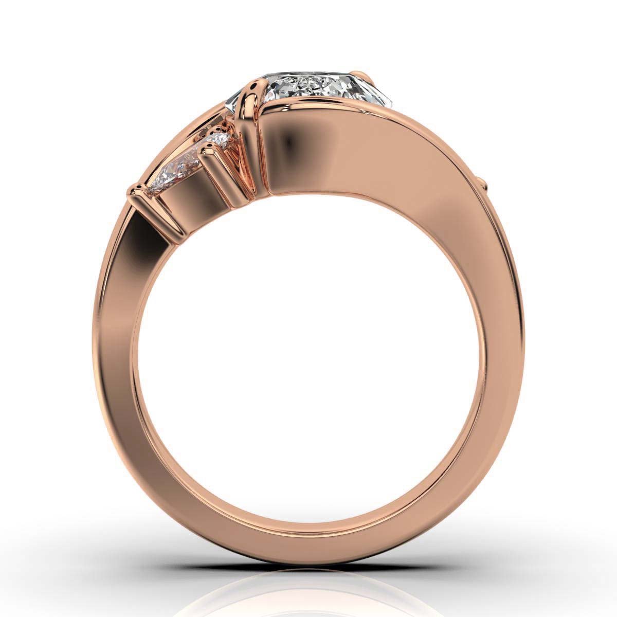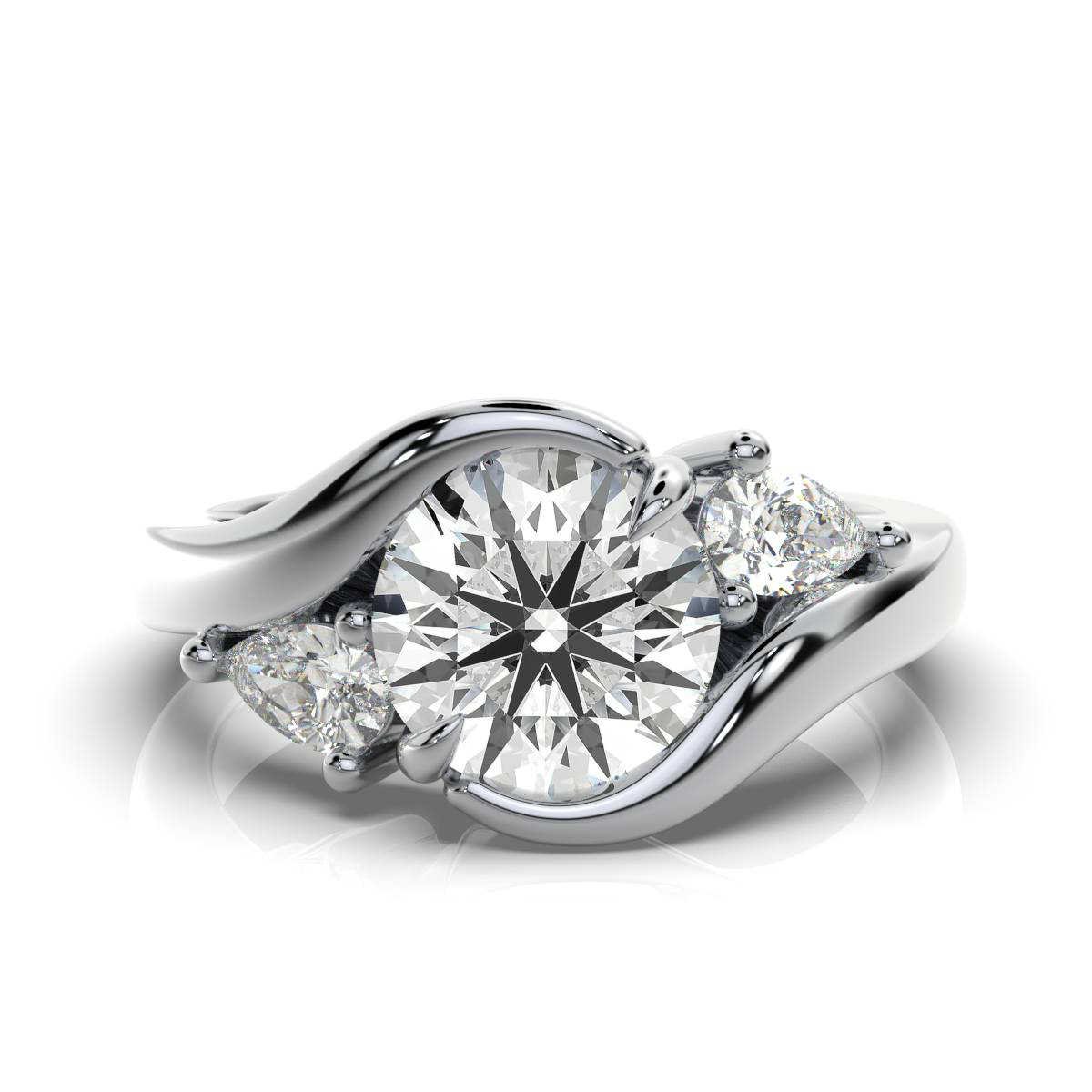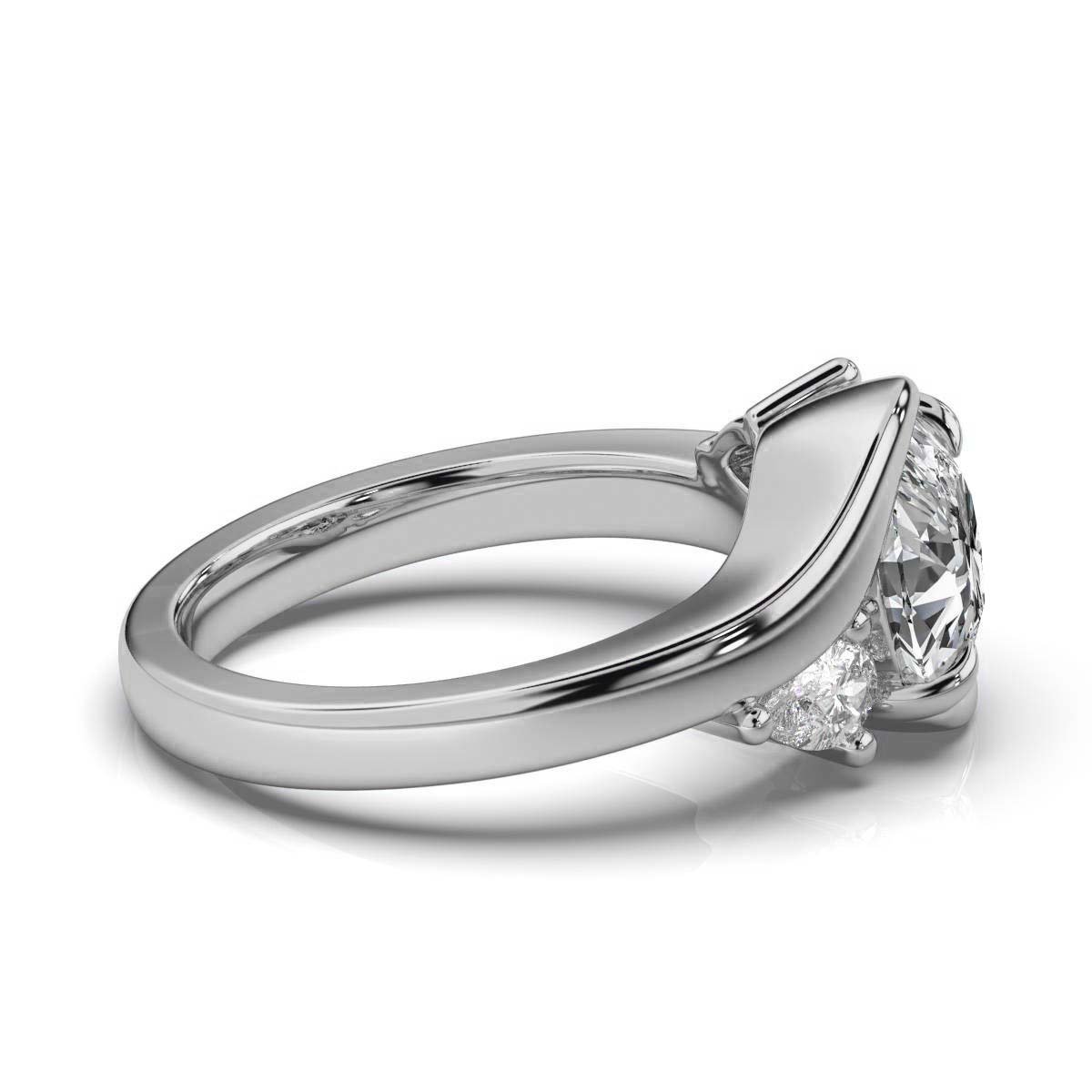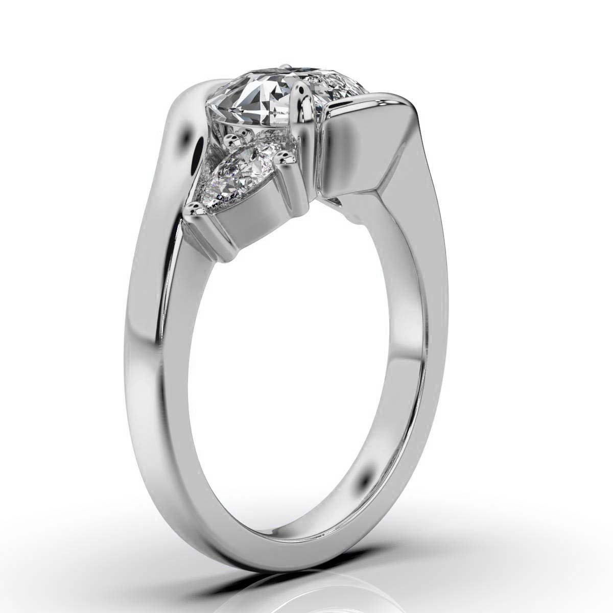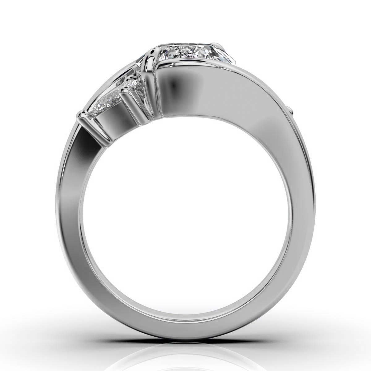 At the heart of this stunning design is a 2.00-carat Super Cut round Moissanite diamond, boasting VVS1 clarity and D color for exceptional fire and brilliance. The Excellent Brilliance rating ensures that the center stone captures and reflects light beautifully, creating a dazzling effect. Flanking the centerpiece are two pear-cut Moissanite side stones, totaling 0.5 carats, which elegantly frame the ring, adding depth and sophistication. The 2.5mm wide and 2mm high band, designed for a comfort fit, ensures both durability and a luxurious feel for everyday wear or special occasions.