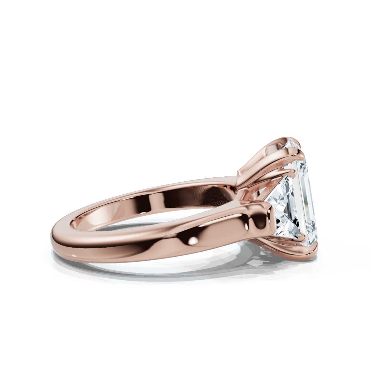 A 18k solid gold three-stone engagement ring featuring a 2ct emerald-cut lab-grown diamond, complemented by 1.5ct trapezoid-cut diamonds. Available in white, yellow, or rose gold, with IGI & BIS certification and a comfortable fit.