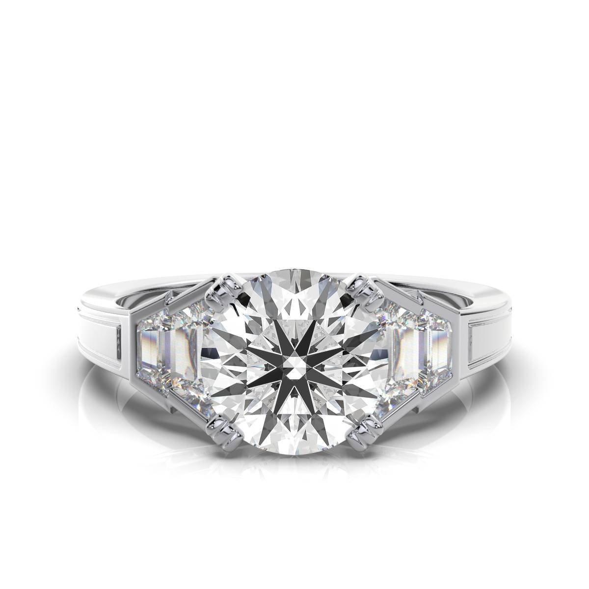 At its heart, a 2 ct round lab-grown diamond shines with F color, VS2 clarity, and Super Cut grading, ensuring exceptional brilliance and fire. Flanking the center stone are two trapezoid-shaped lab-grown diamonds, totaling 1.48 ct, enhancing the ring’s regal allure with geometric precision and dazzling symmetry.