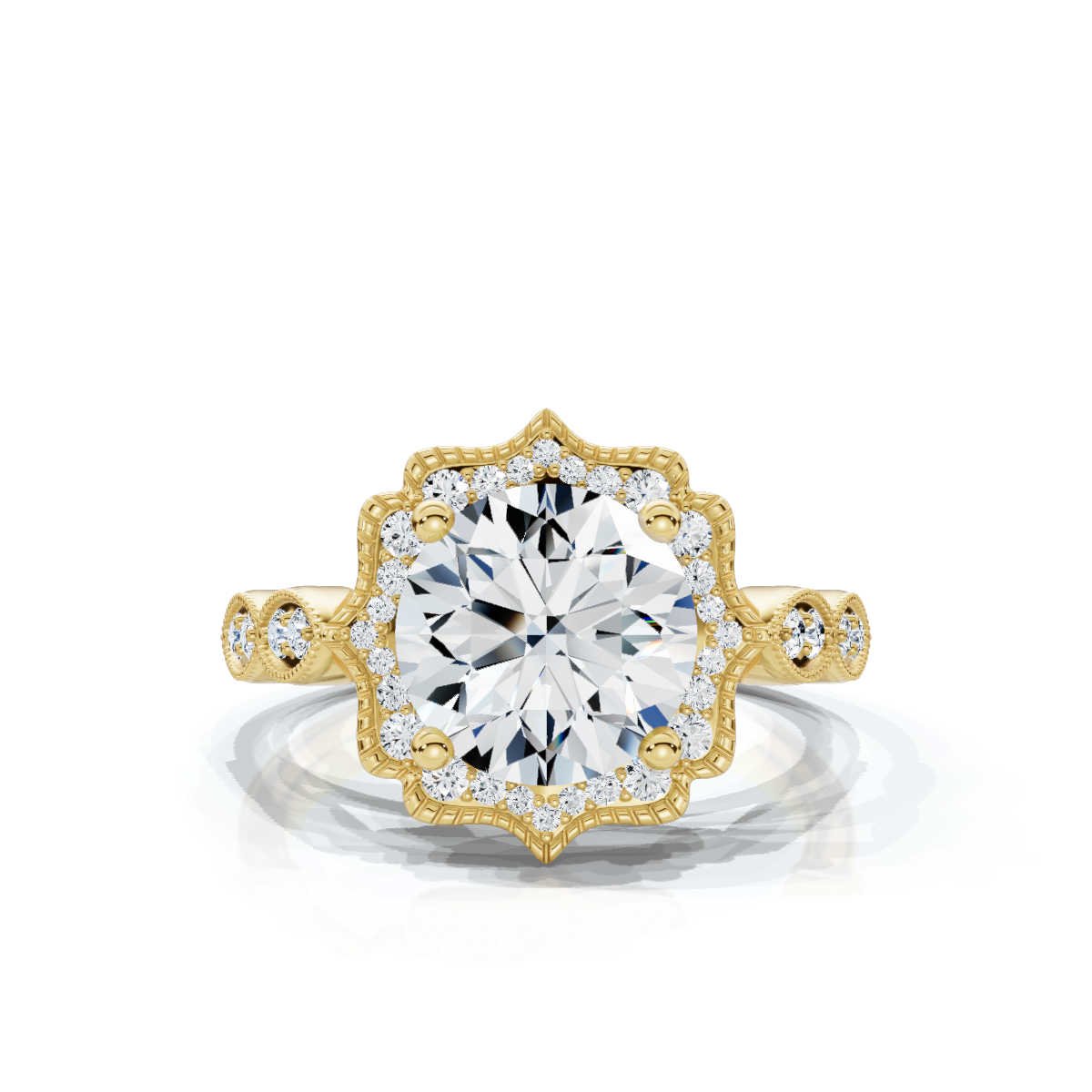This 18k Solid Gold Vintage Lab-Grown Diamond Engagement Ring features a 2ct F/VS2 Super Cut center diamond with 36 side stones (0.23Ctw). Available in White, Rose, and Yellow Gold, it is IGI & BIS Hallmarked for authenticity.