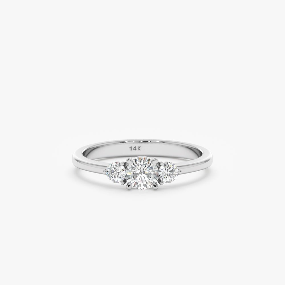 Three-stone engagement ring with 0.36 Ct natural diamonds in 14K solid gold. Available in yellow, white, or rose gold. GIA & BIS certified.
