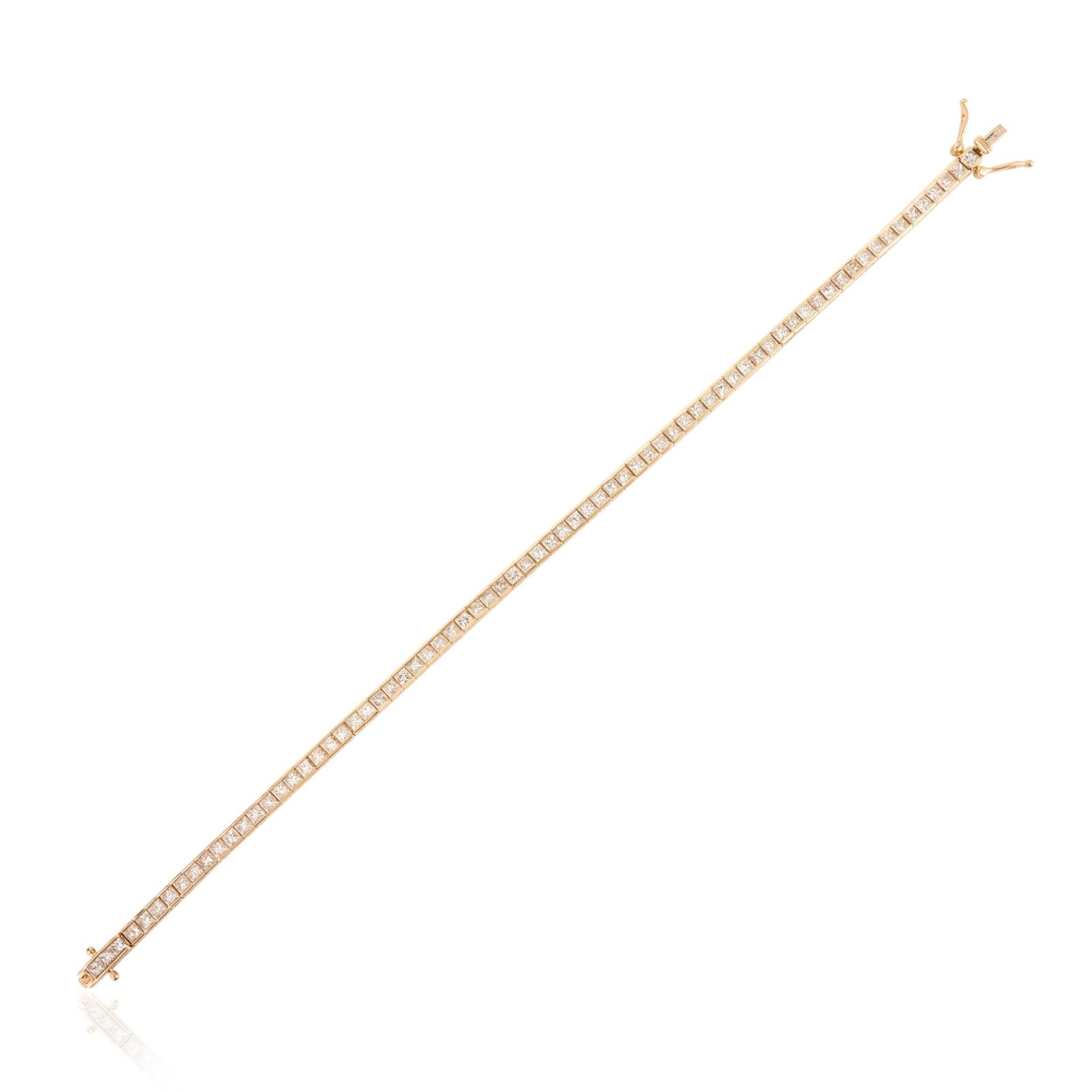 Indulge in the luxurious elegance of our 14K Solid Yellow Gold Diamond Tennis Bracelet, a testament to sophistication and timeless beauty. Crafted from premium 14K solid yellow gold, this bracelet features a stunning display of square-cut diamonds totaling 4.42 carats. Each diamond, measuring 2.5 mm, is meticulously set in a secure half bezel setting, which combines the elegance of a bezel with the visibility of a prong setting, allowing light to enhance the diamonds’ brilliance.